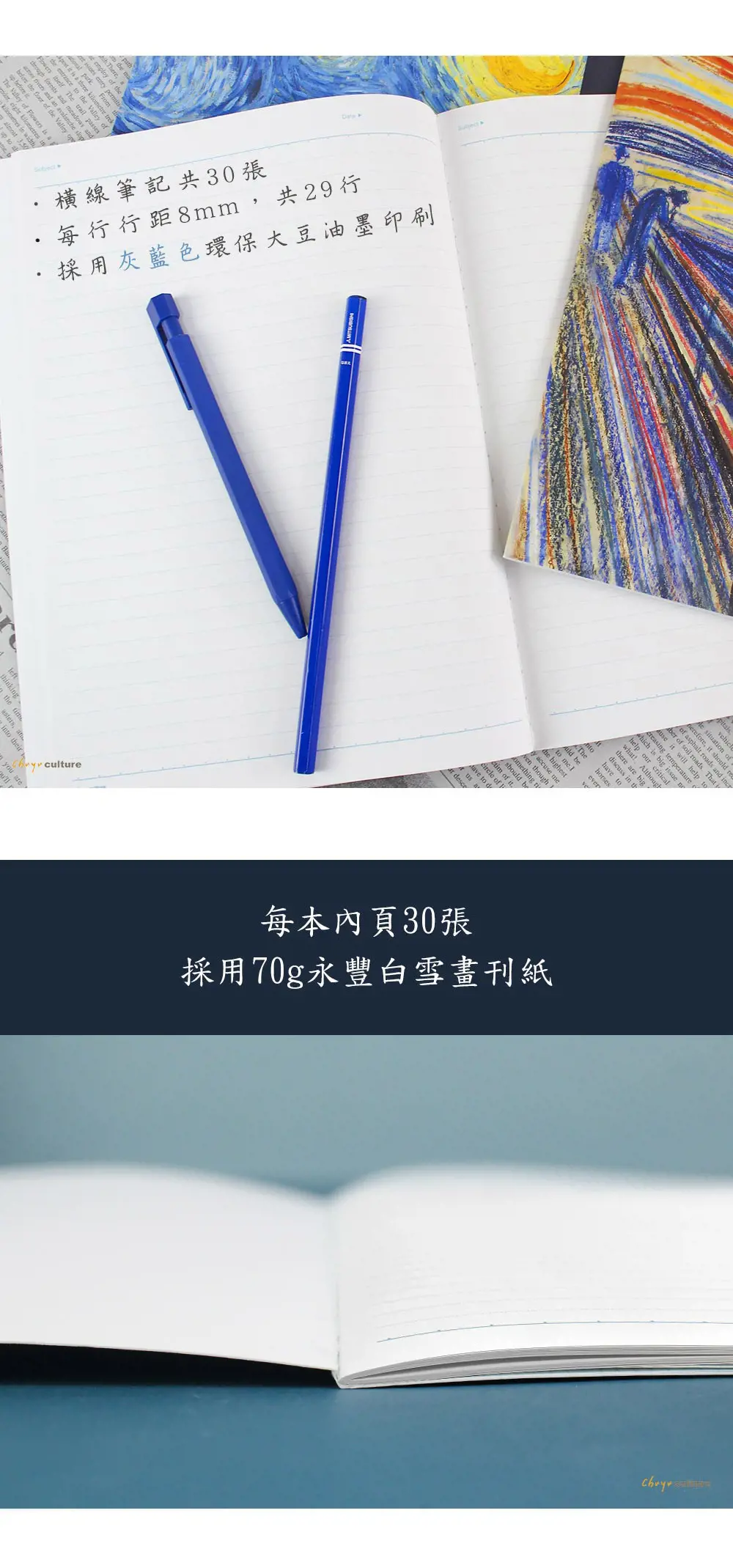 - 橫線內頁共30張,每行行距8mm,共29行,採灰藍色無毒大豆油墨印刷