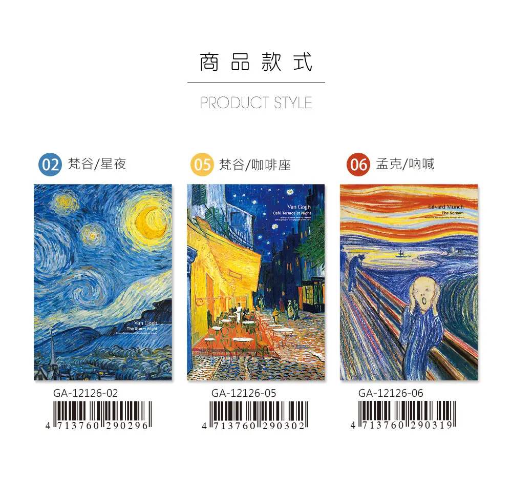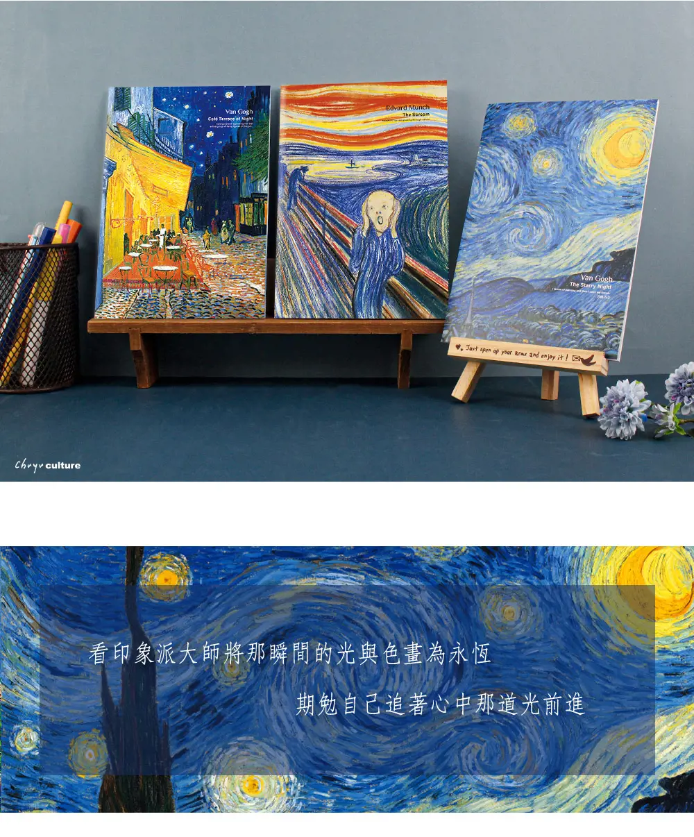 - 封面選用印象派大師-梵谷、孟克的名畫作滿版印刷,一起欣賞名畫之美