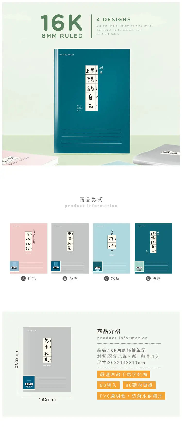 【商品說明】 1. 青青 簡單生活系列 CZ-886 16K 東康橫線筆記(262X192X11mm) 2. 圓點幫助對齊文頭,直式也能書寫 3. 內頁精心規劃,多元化使用方式 4. 四款精美封面,任君挑選~