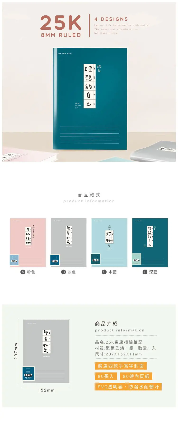 【商品說明】 1. 青青 簡單生活系列 CZ-887 25K 東康橫線筆記(207X152X11mm) 2. 圓點幫助對齊文頭,直式也能書寫 3. 內頁精心規劃,多元化使用方式 4. 四款精美封面,任君挑選~