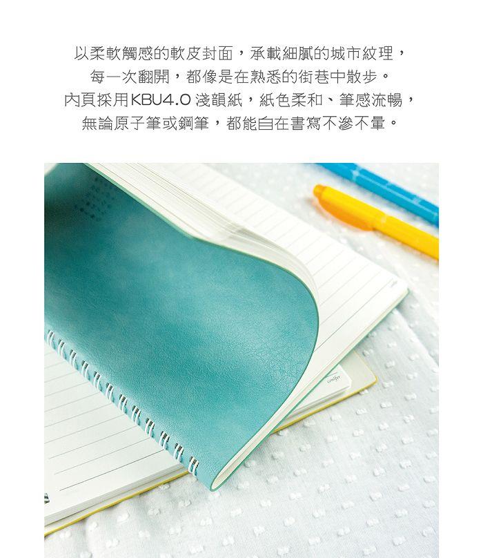 以柔軟觸感的軟皮封面,承載細膩的城市紋理,每一次翻開,都像是在熟悉的街巷間散步。內頁採用 KBU4.0 淺韻紙,紙色柔和、筆感流暢,無論原子筆或鋼筆,都能自在書寫不滲不暈。