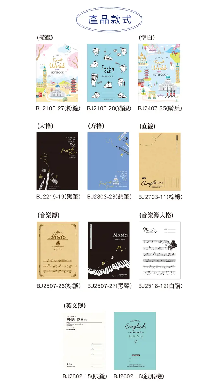 § 有大格、橫線、方格、空白、音樂簿等款式供您選擇。