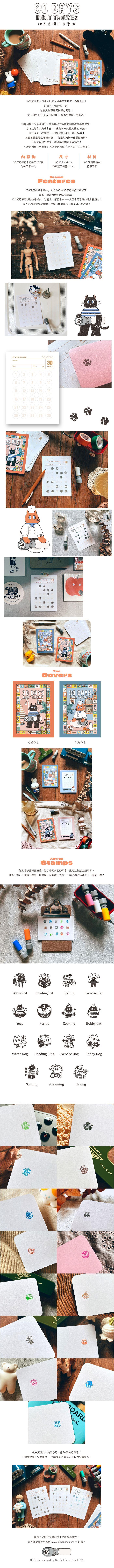 『30天目標打卡套組』內含100張30天目標打卡紀錄表,還有一個超可愛的腳印連續章。打卡紀錄表可以貼在書桌前、冰箱上、筆記本中——只要你常看到的地方都適合!