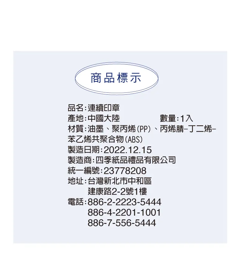 • 材質:油墨、聚丙烯(PP)、丙烯腈-丁二烯-苯乙烯共聚合物(ABS)