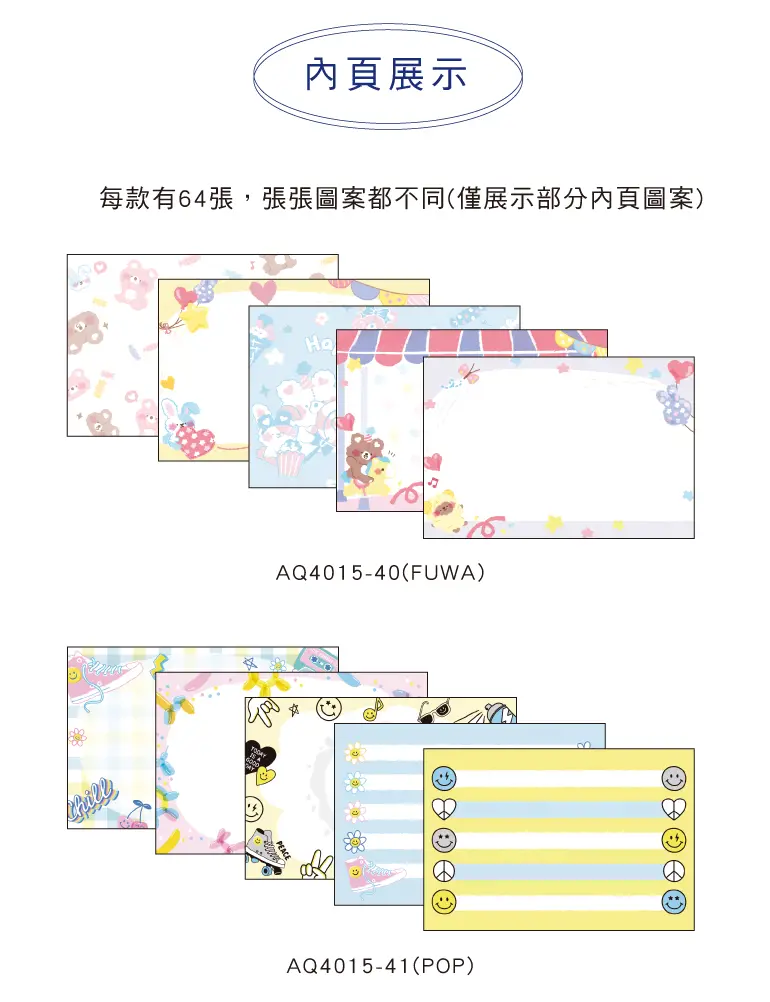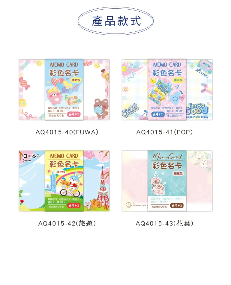 § 規格:9.4x6.3cm,每款有64張不同圖案,4種款式。
