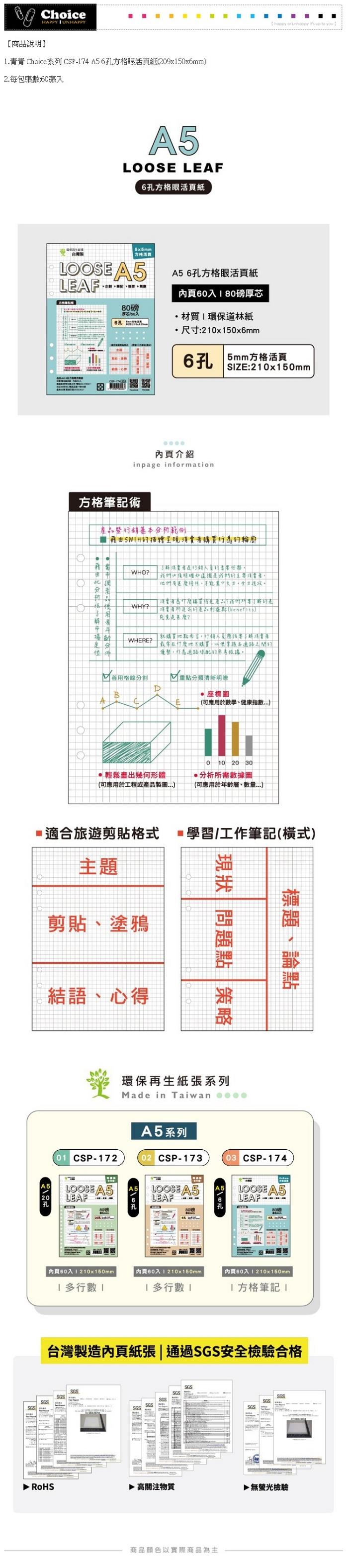 ◎青青 Choice系列 CSP-174 A5 6孔方格眼活頁紙(209x150x6mm)