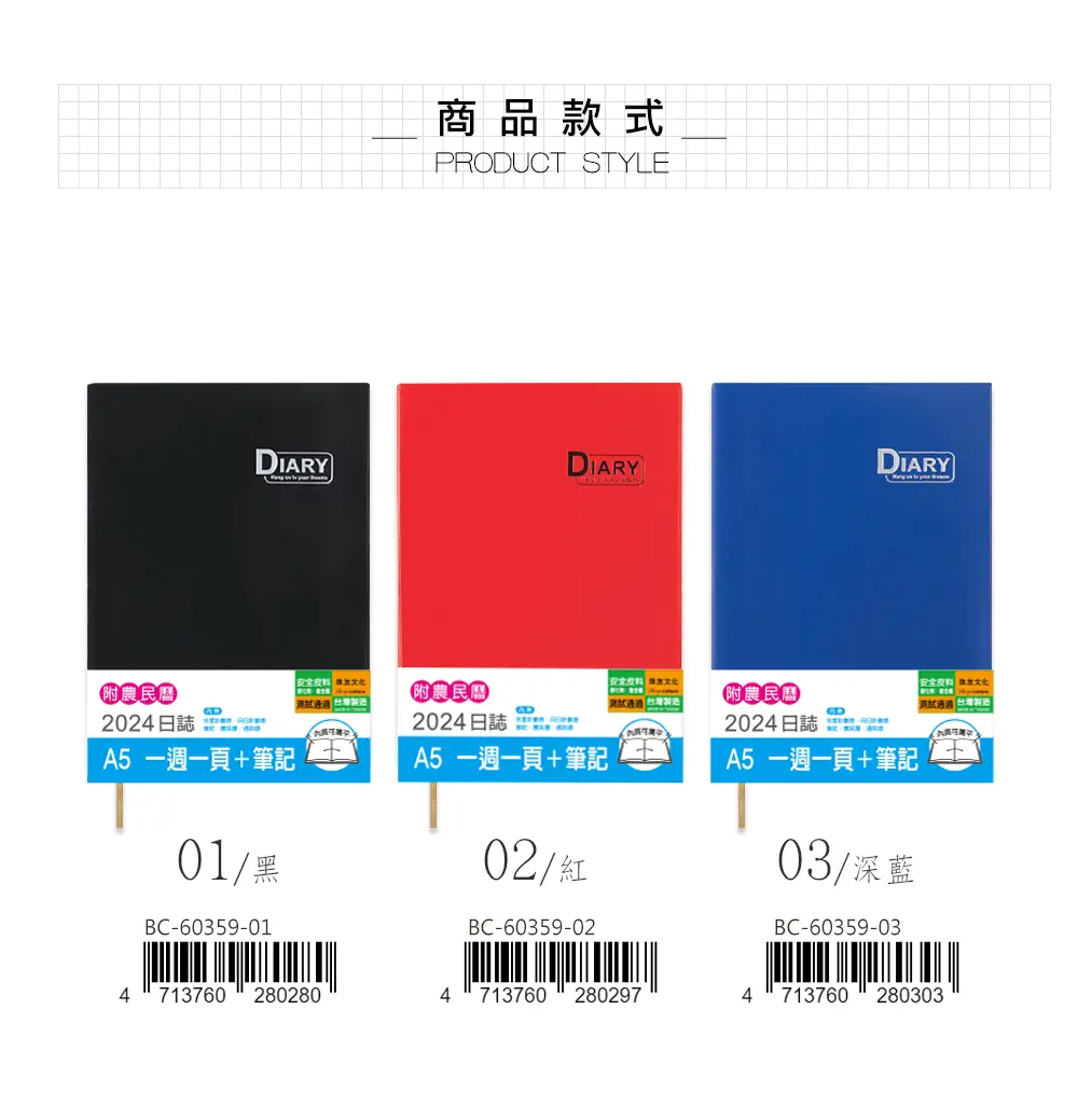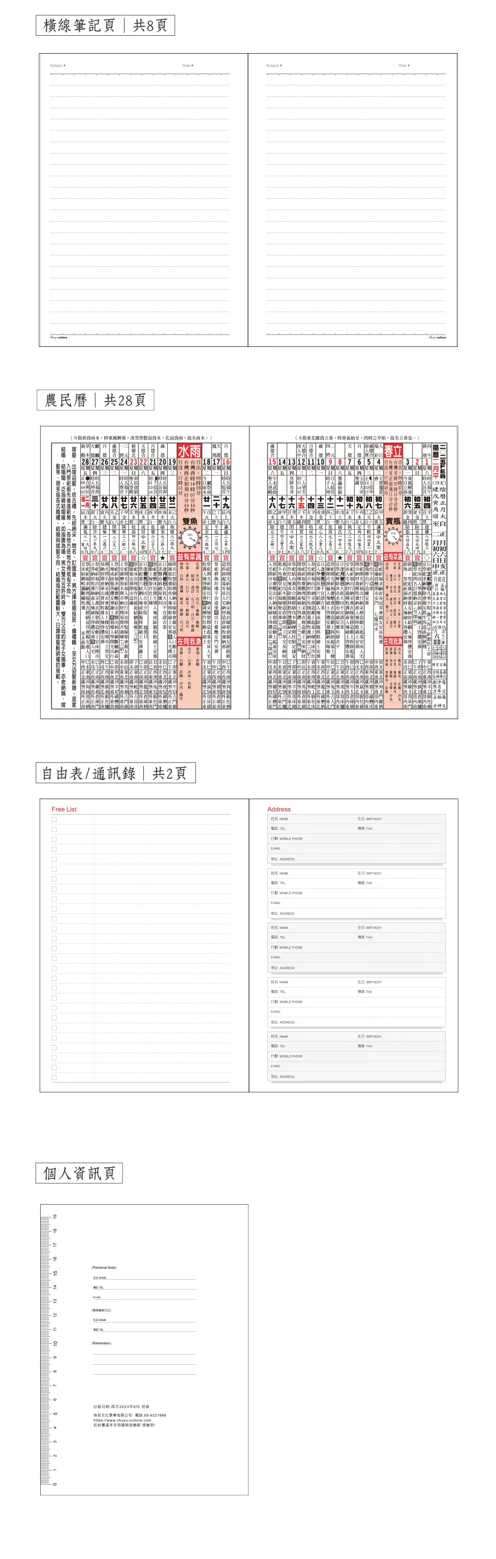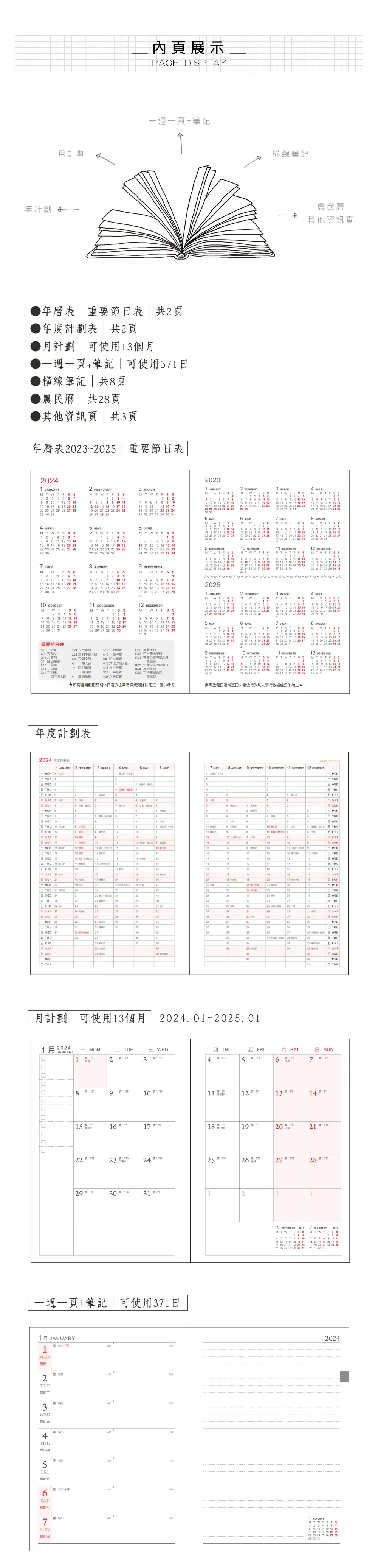 - 內容:年曆表.年月計劃.週計劃頁.農民曆
