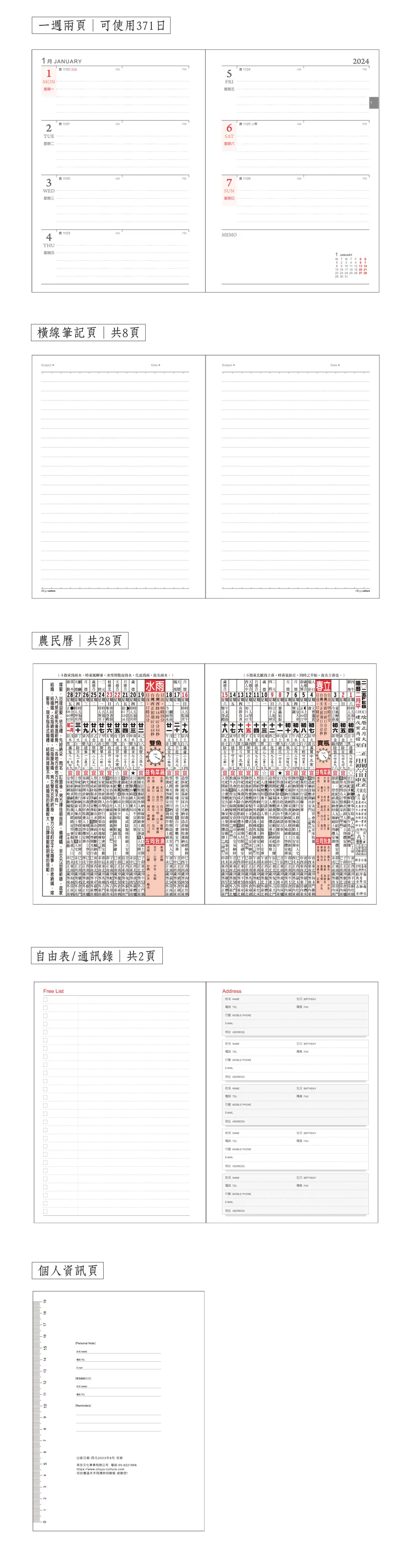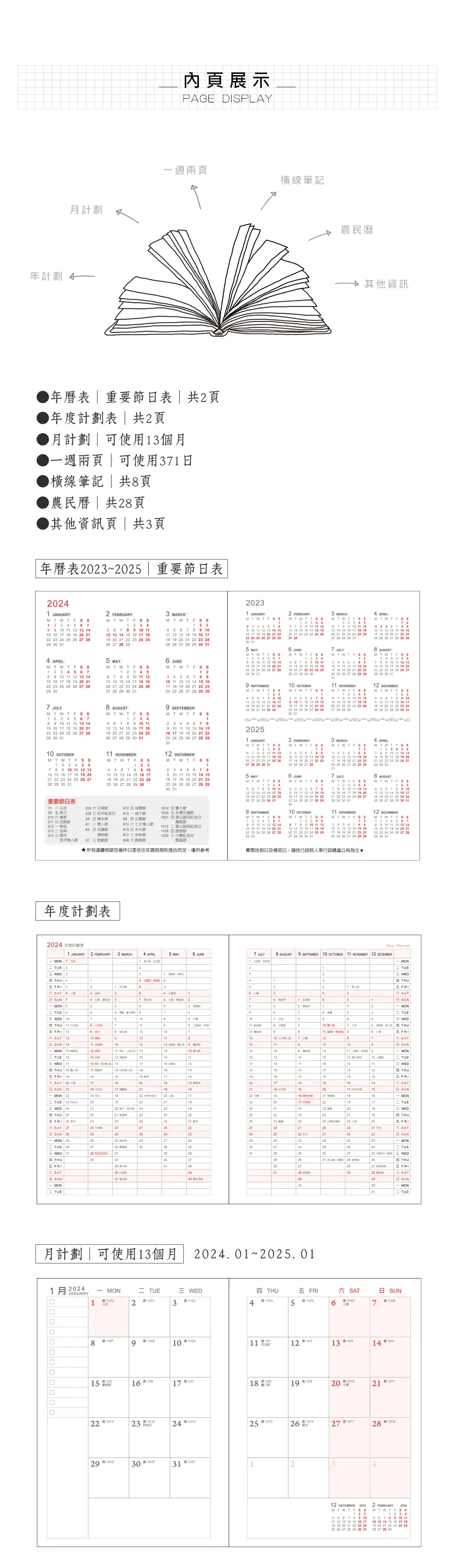 - 內容:年曆表.年月計劃.週計劃.農民曆