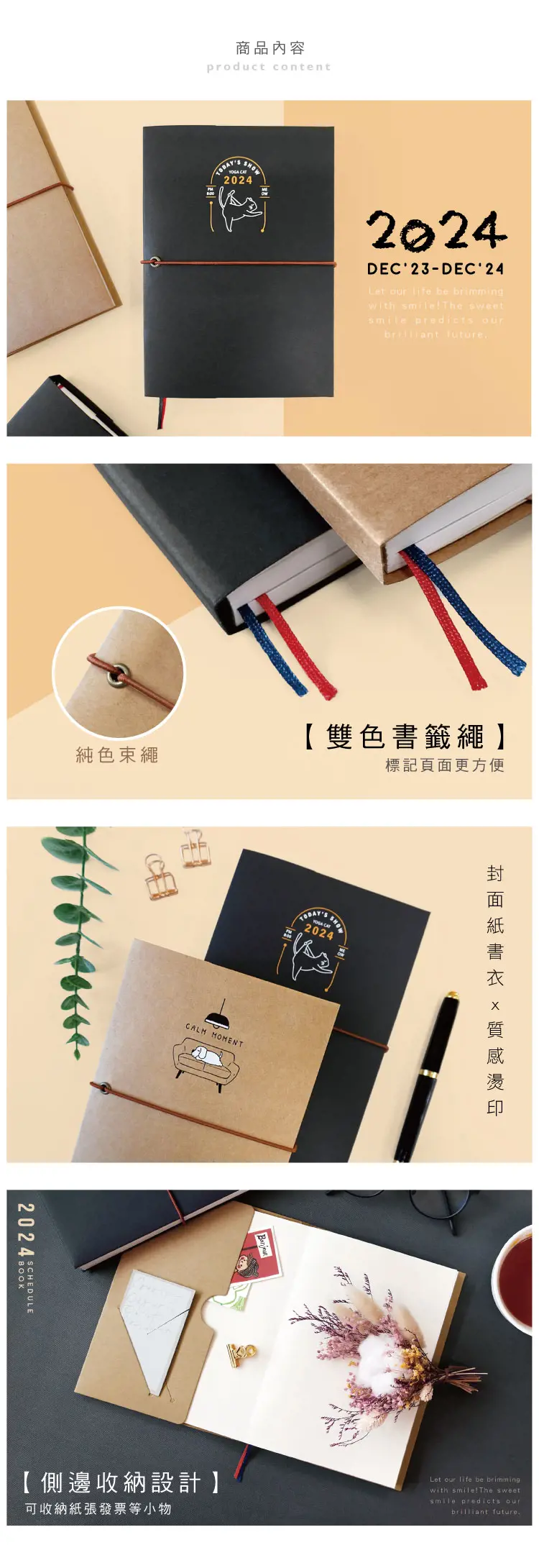 1.青青 簡單生活系列 CDM-385 2024 32K年度雙色紙書衣手冊(190x135x16mm) 2.日期:2023.12-2024.12 3.質感雙色書籤帶 4.封面紙書衣X質感燙印 5.純色束繩:固定手帳,東西不易掉出 6.內頁平攤好書寫 7.書衣內側可收納名片和小物 8.兩頁一週,書寫空間大