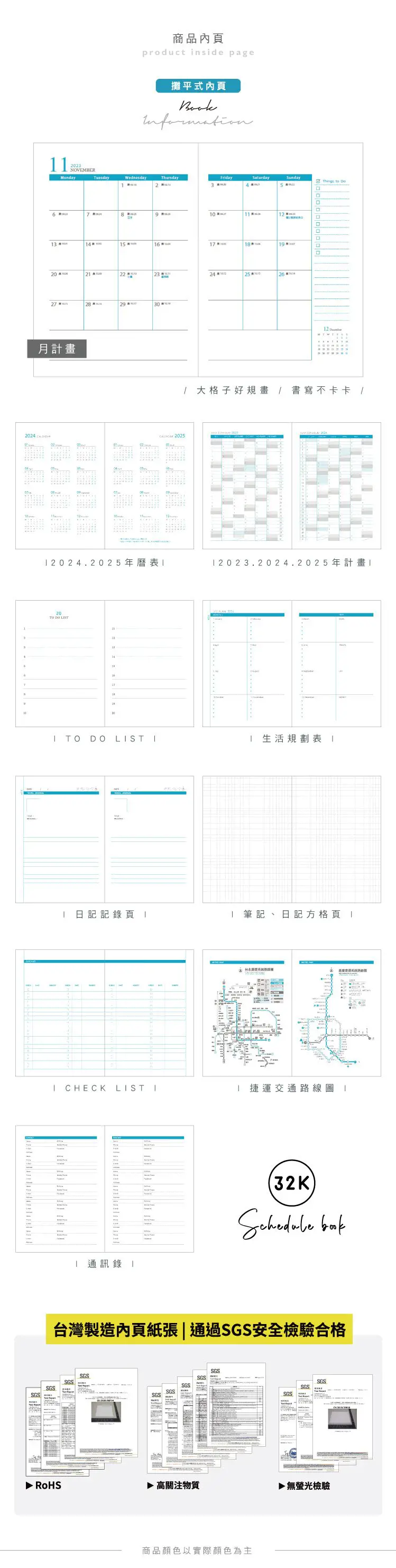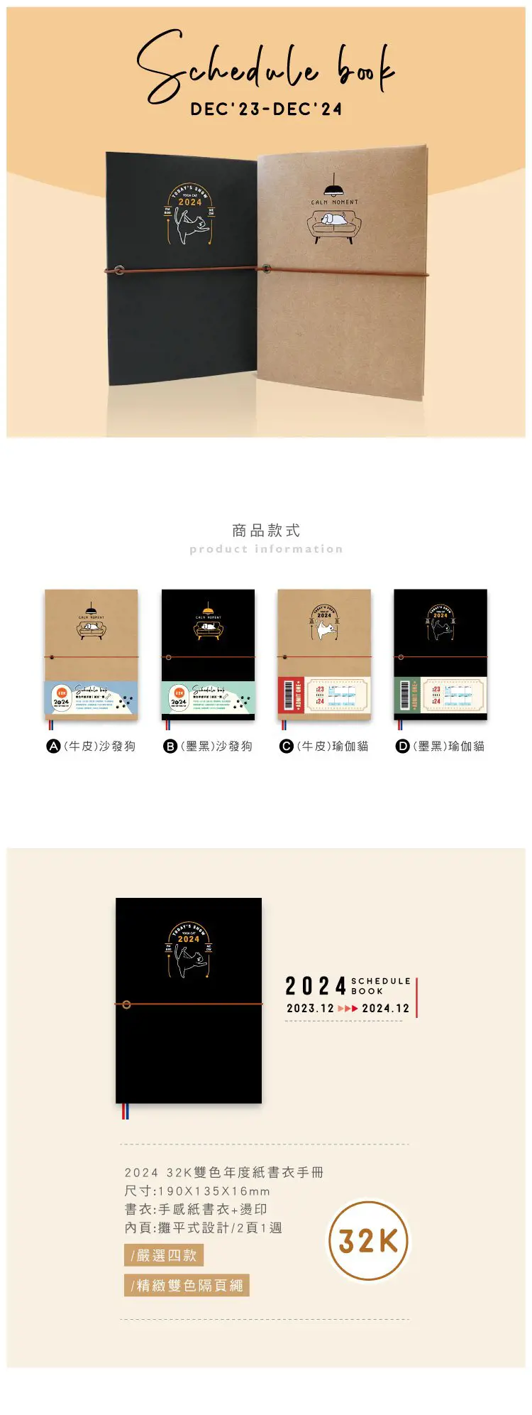 1.青青 簡單生活系列 CDM-385 2024 32K年度雙色紙書衣手冊(190x135x16mm) 2.日期:2023.12-2024.12 3.質感雙色書籤帶 4.封面紙書衣X質感燙印 5.純色束繩:固定手帳,東西不易掉出 6.內頁平攤好書寫 7.書衣內側可收納名片和小物 8.兩頁一週,書寫空間大