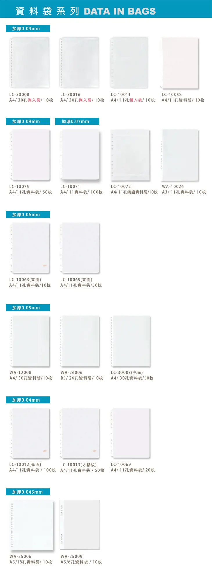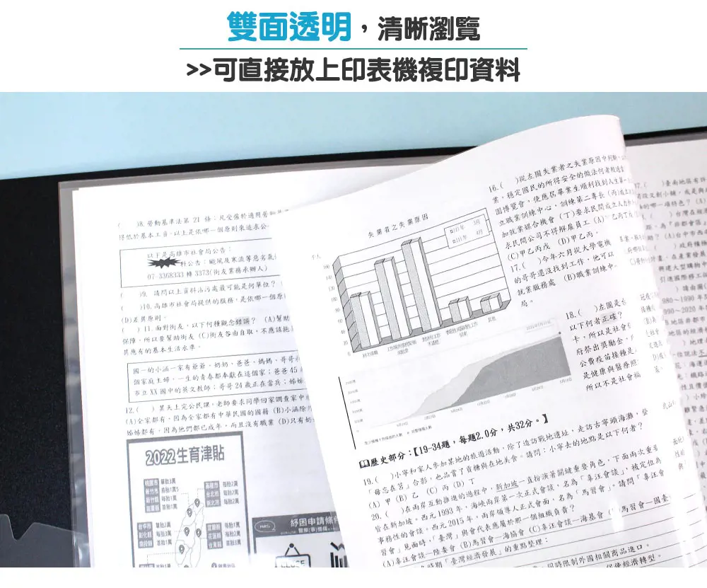 - 資料袋厚度0.07mm,雙面清晰瀏覽,可直接影印文件