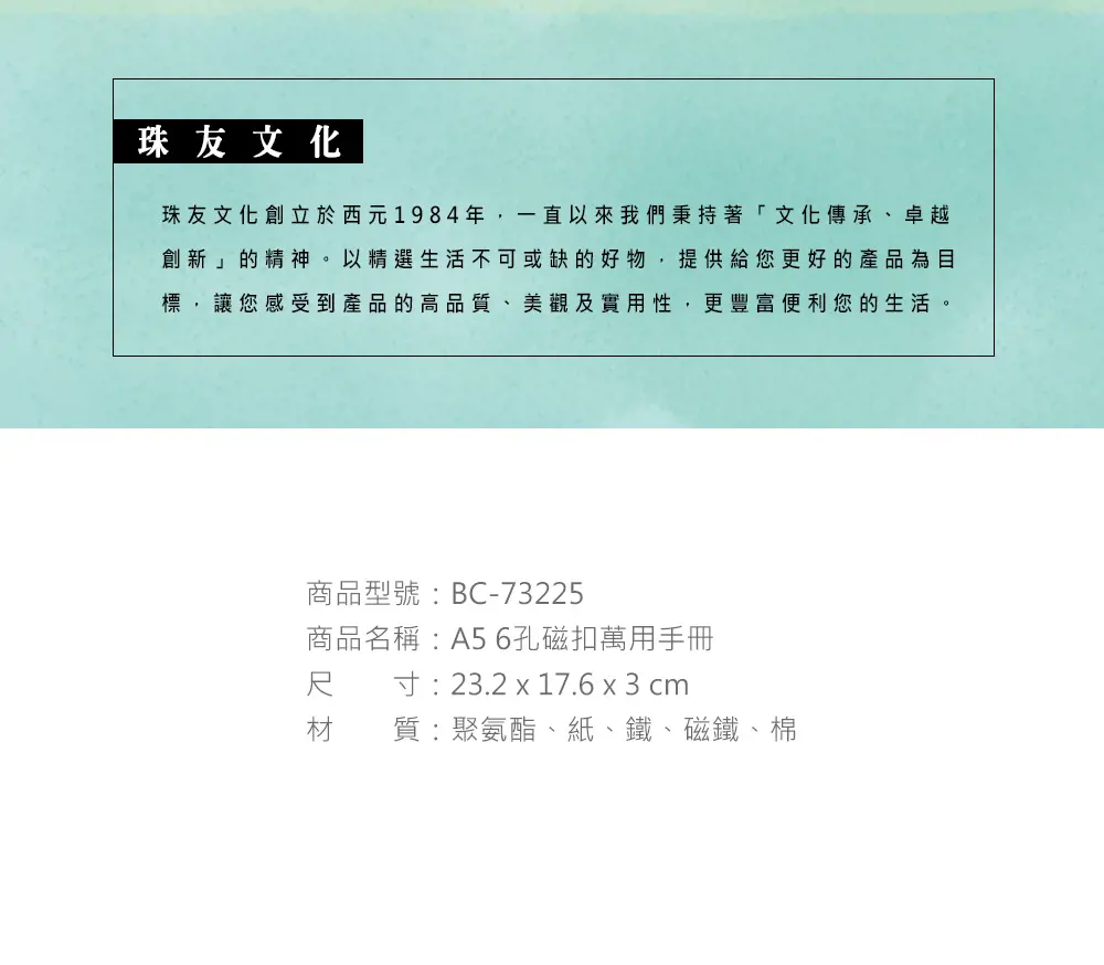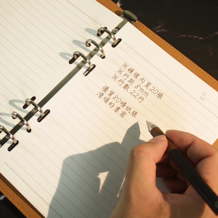 - 6孔鐵夾,增減內頁便利,磁性卡扣開關方便