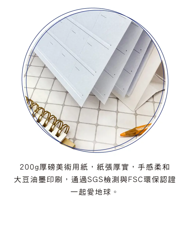 § 200g厚磅美術用紙,紙張厚實,手感柔和。