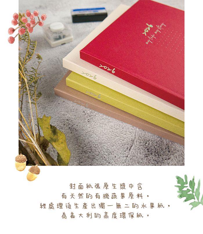 封面紙張原生漿中含有天然的有機水果原料,經處理後生產出獨一無二的水果紙,為義大利高度環保紙。