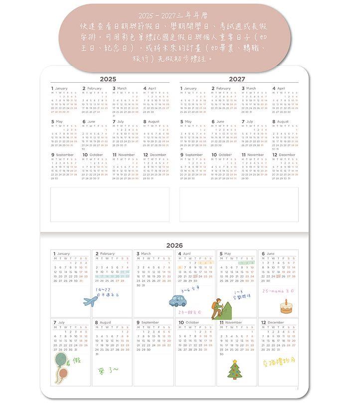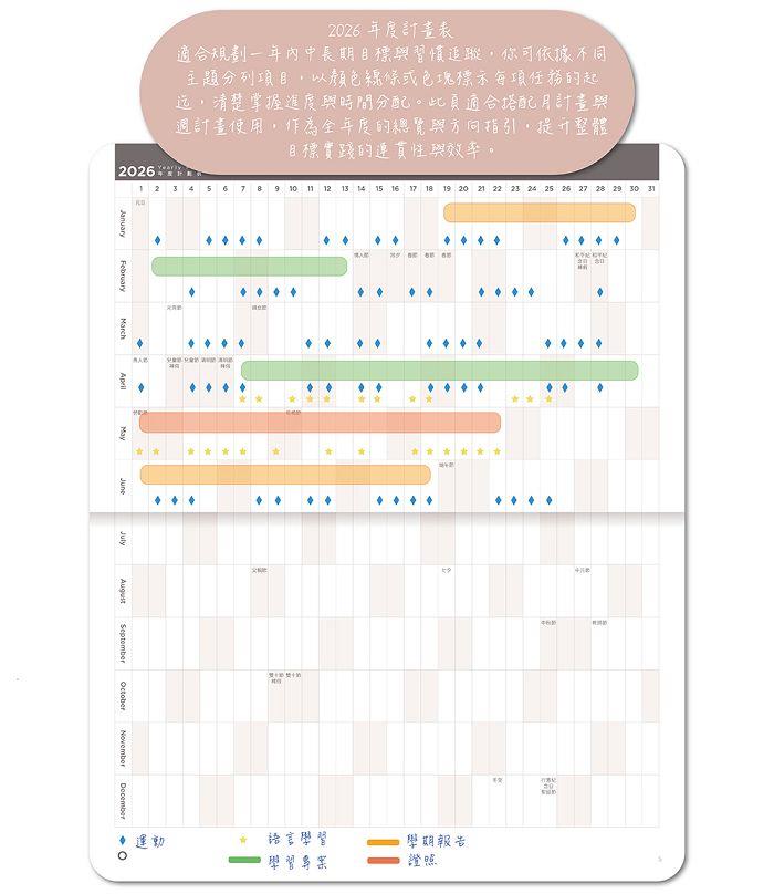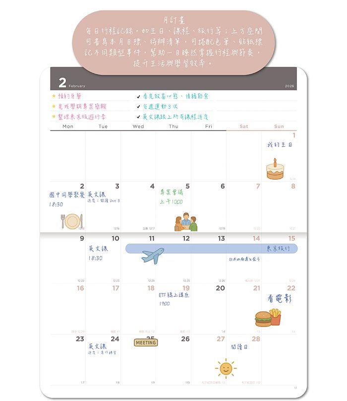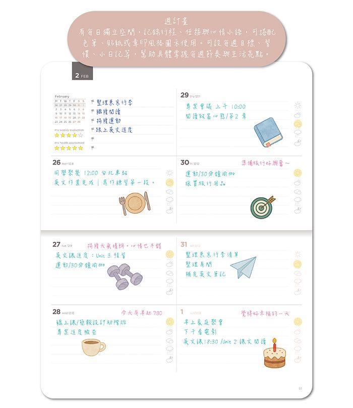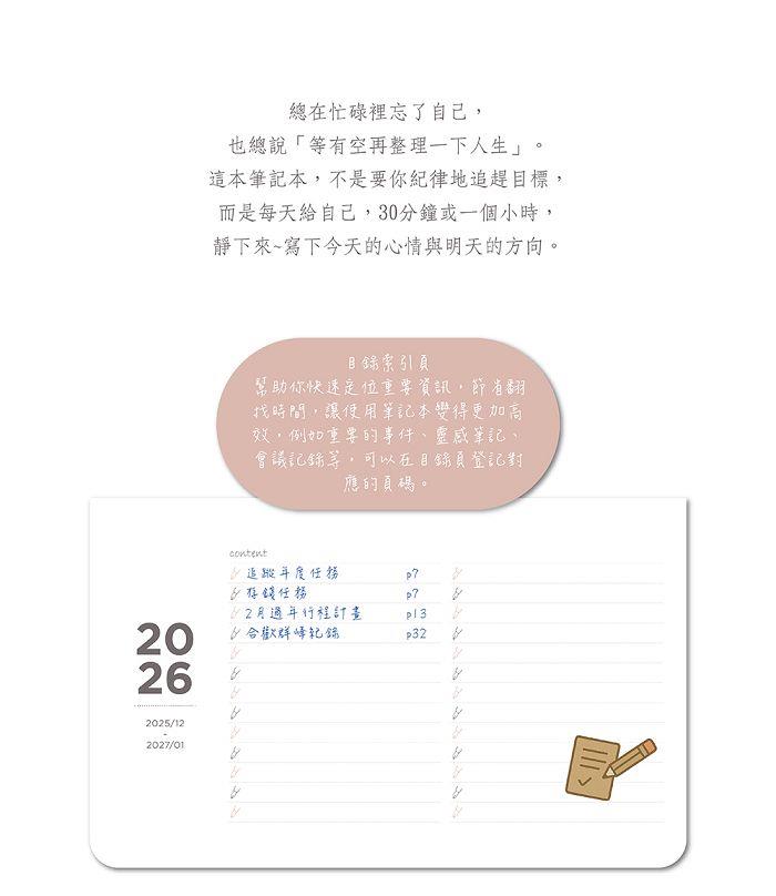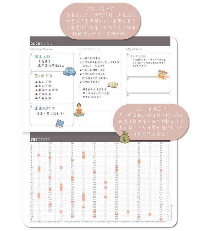 實用內容,一本搞定年度規劃 包含 3 年年曆、年計畫、任務設定、小資儲蓄表、月計畫與週計畫,層層推進目標,讓生活與成長井然有序。
