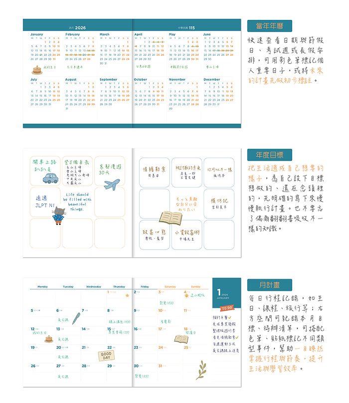 簡約月記事設計:每月一跨頁,格子留白恰到好處,適合記下重要日程、生活提醒、學習進度或心情符號,簡潔明瞭,一目了然。方形便攜設計:12.4 x 12.4 cm 精巧尺寸,收納輕巧,翻開不占桌面,手帳控與學生都能輕鬆攜帶。