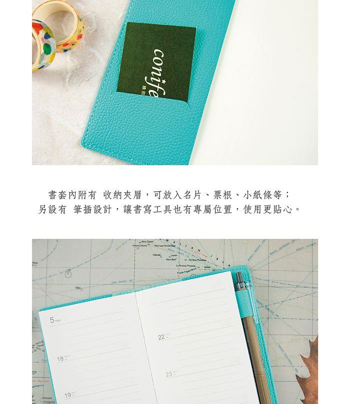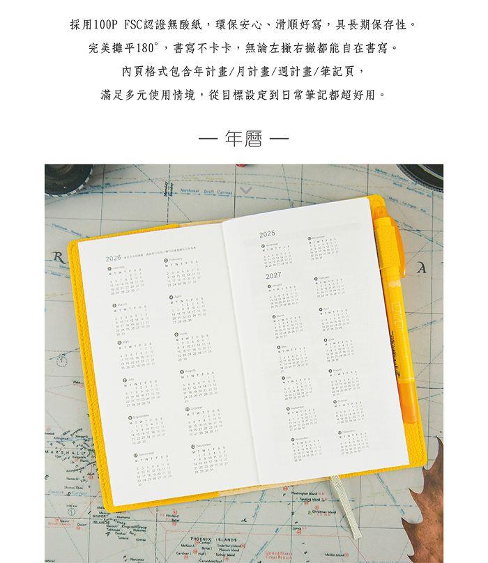 經典荔枝皮紋書套 顯現專業的你經典內頁格式 大大空間足夠記錄精彩的行程內頁採用100P無酸紙,為FSC認證環保紙張,紙質穩定不易滲墨,給予流暢的書寫手感,可以180度攤平,跨頁部分也能平整書寫。