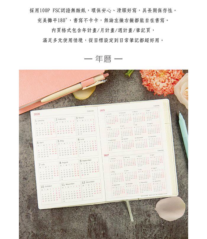 特殊揉紙紋路的皮革書套 顯現氣質高雅的你經典內頁格式 大大空間足夠記錄精彩的行程內頁採用100P無酸紙,為FSC認證環保紙張,紙質穩定不易滲墨,給予流暢的書寫手感,可以180度攤平,跨頁部分也能平整書寫。