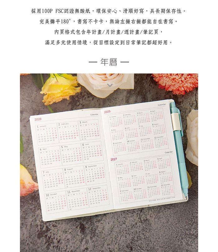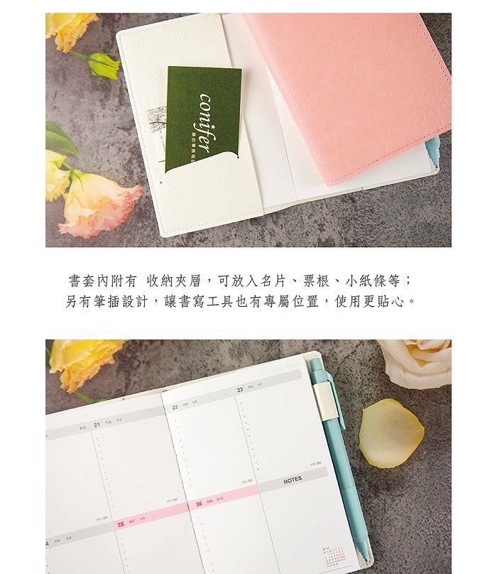 特殊揉紙紋路的皮革書套 顯現氣質高雅的你經典內頁格式 大大空間足夠記錄精彩的行程內頁採用100P無酸紙,為FSC認證環保紙張,紙質穩定不易滲墨,給予流暢的書寫手感,可以180度攤平,跨頁部分也能平整書寫。