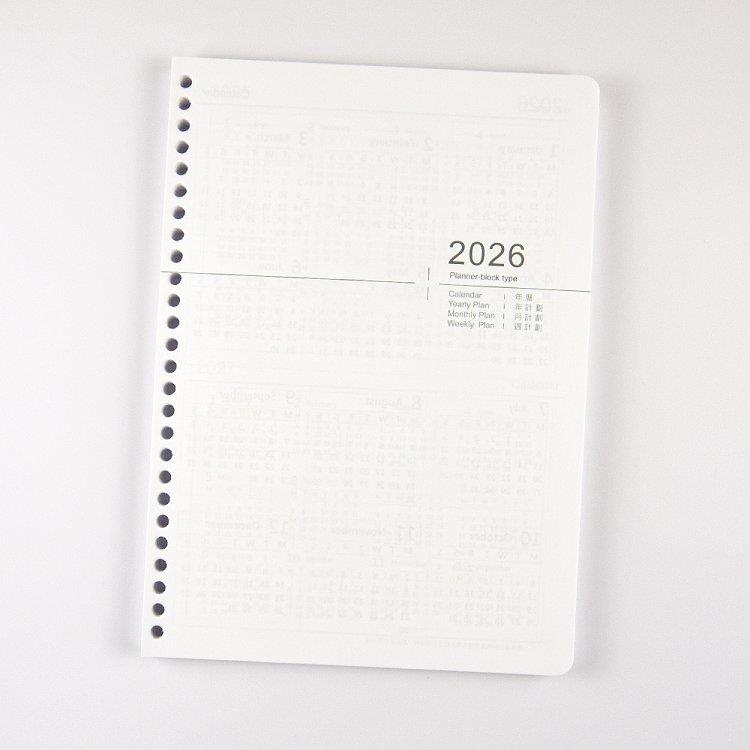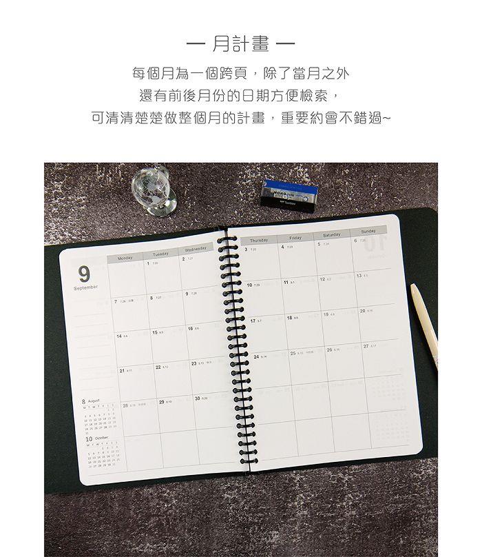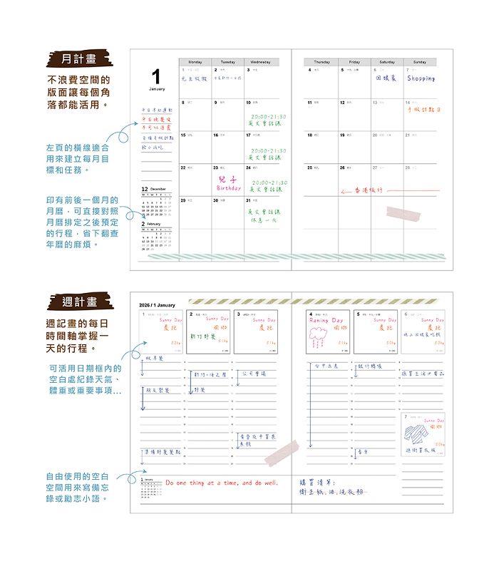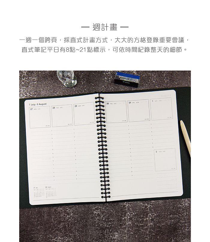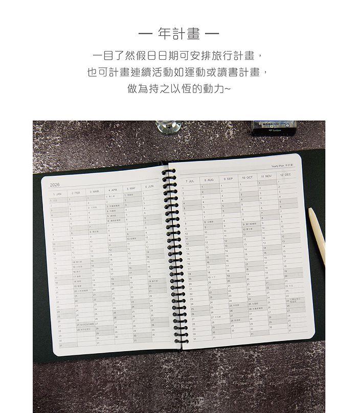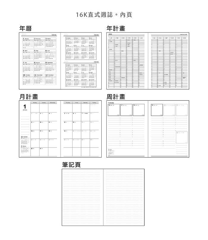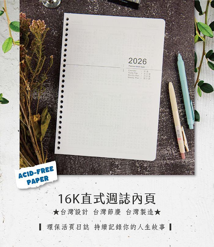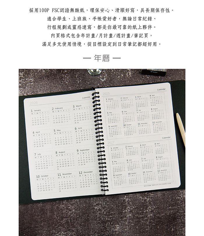 內頁採用100P無酸紙,為FSC認證環保紙張,紙質穩定不易滲墨,給予流暢的書寫手感,內頁順序:年曆2P→年計畫2P→月計畫24P→週計畫106P→橫線筆記頁24P★適用26孔孔夾★