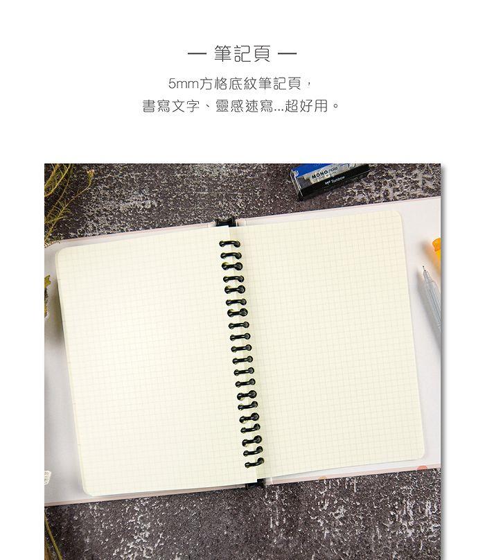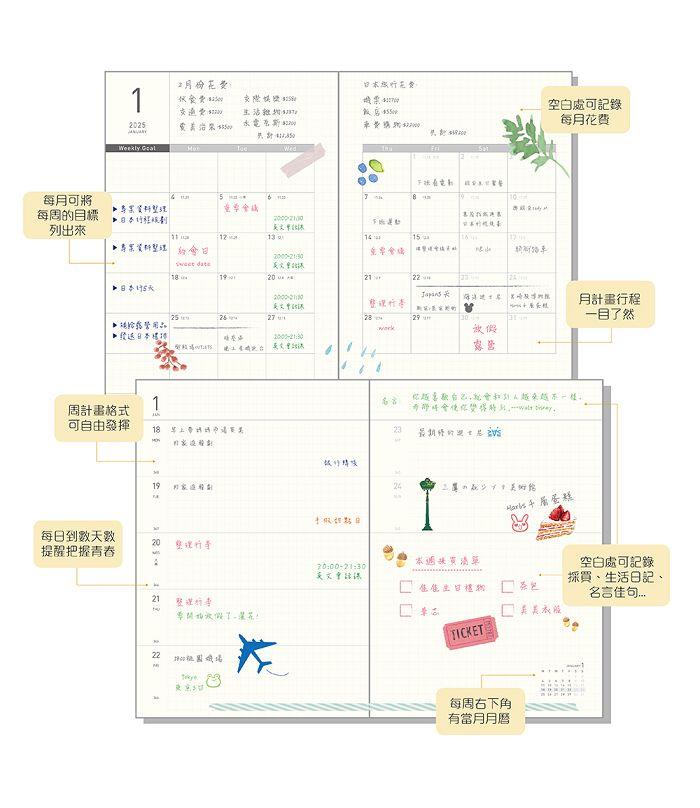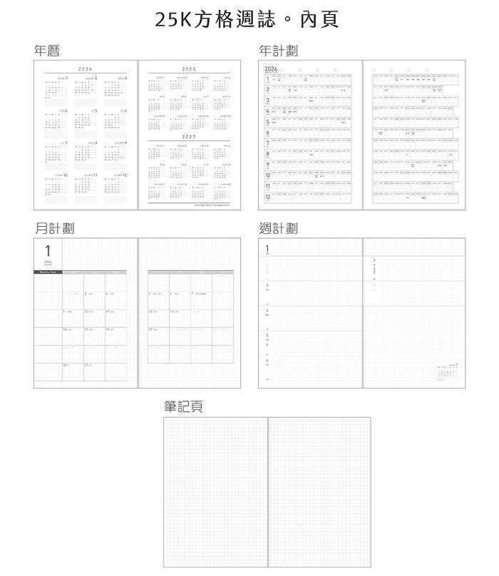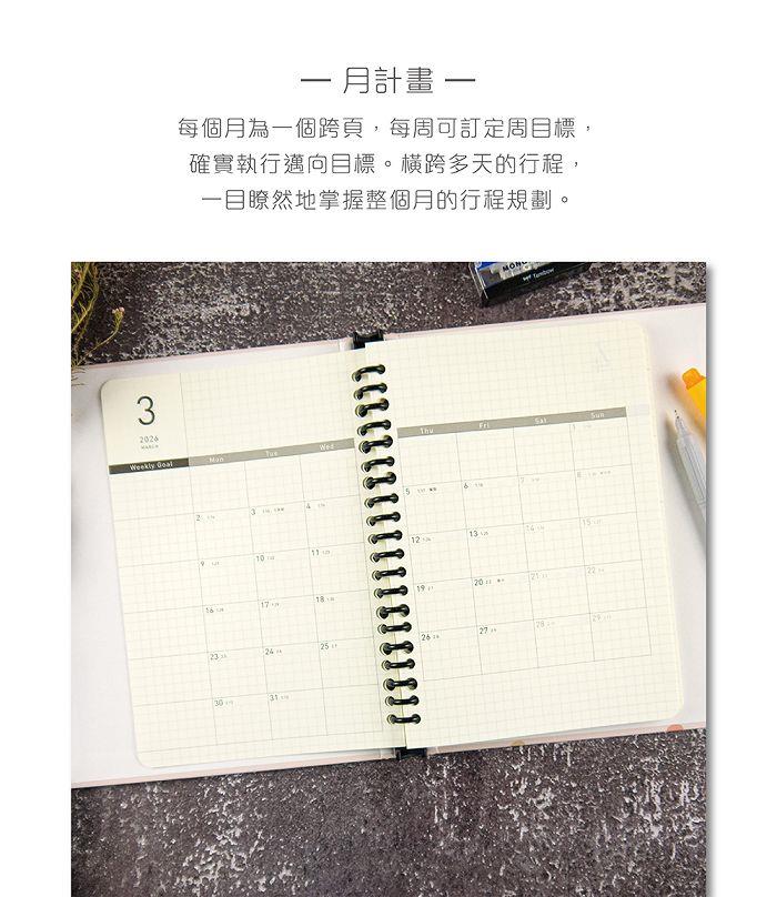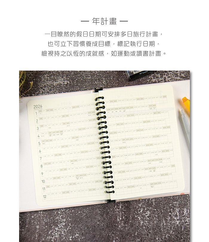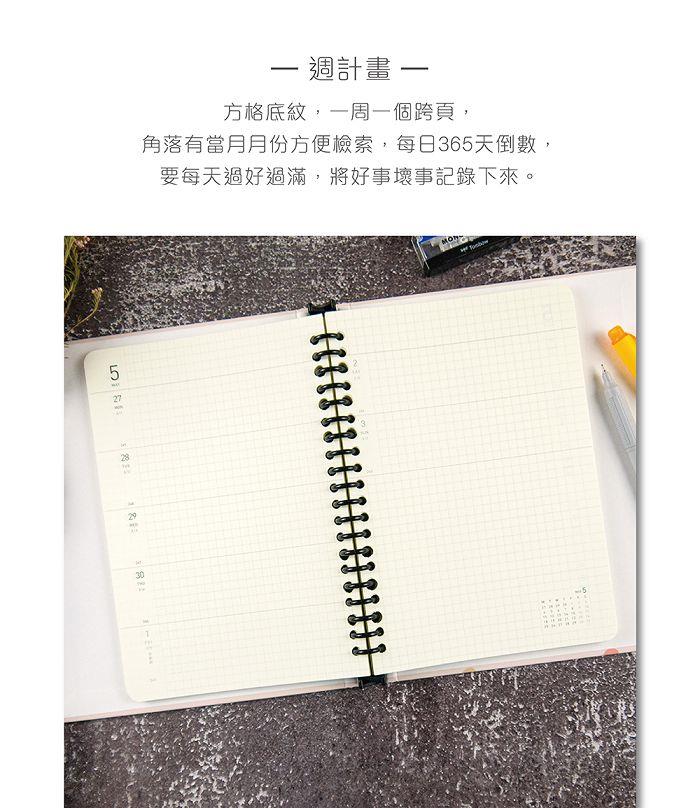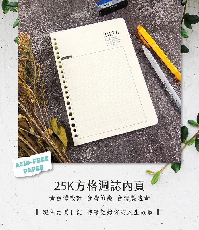 80P米色鋼筆專用無酸紙為FSC認證環保紙張紙質穩定不易滲墨,給予流暢的書寫手感內頁順序:目錄2P、年曆2P、好習慣養成2P、月計畫6P、週計畫106P、點點筆記頁72P★適用20孔與6孔孔夾★