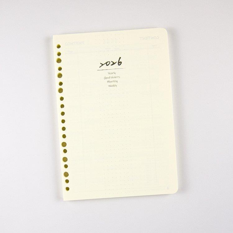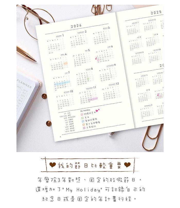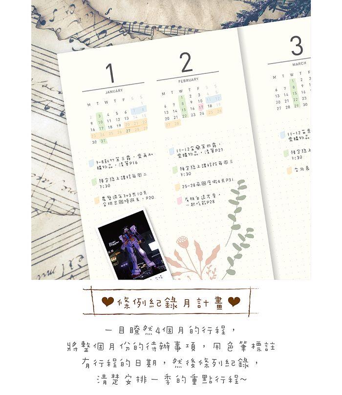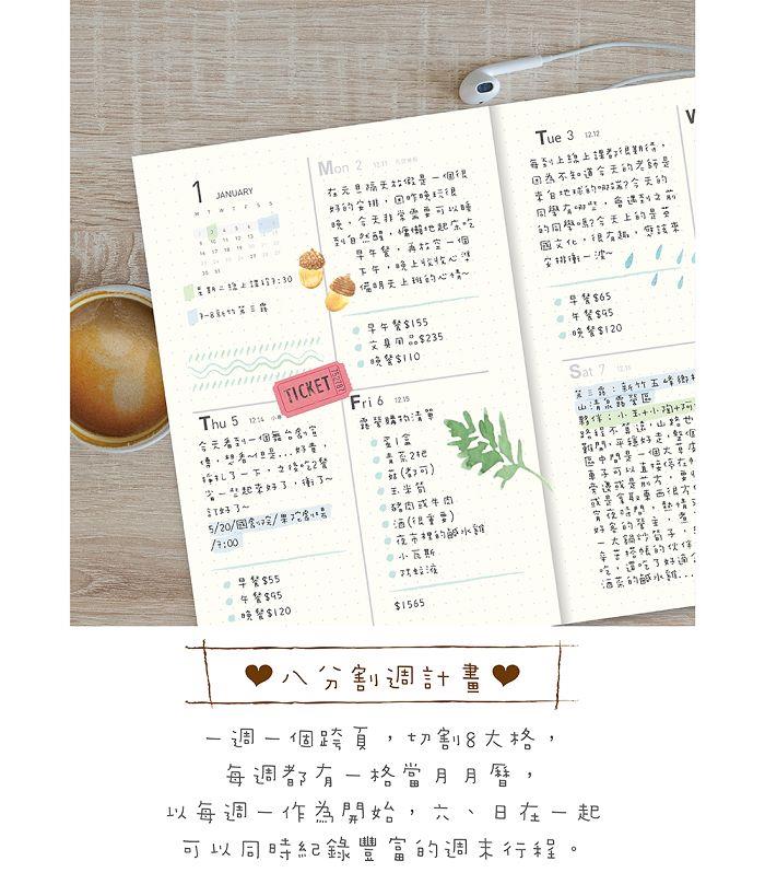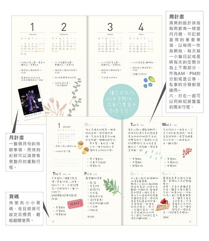 100P FSC米色中性無酸紙為FSC認證環保紙張紙質穩定不易滲墨,給予流暢的書寫手感內頁順序:年曆2P、年計劃2P、年目標2P、心願單2P、儲蓄表2P、甘特圖12P、月計劃24P 、週計劃106、筆記頁6P★適用20孔與6孔孔夾★