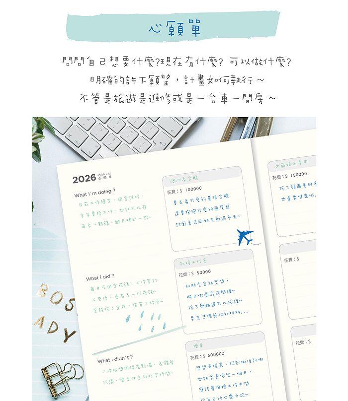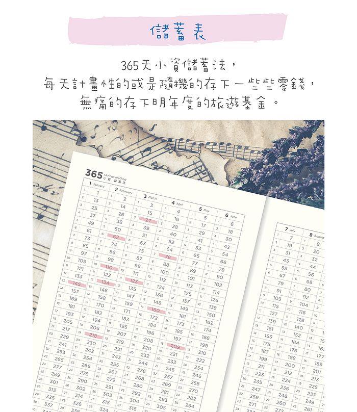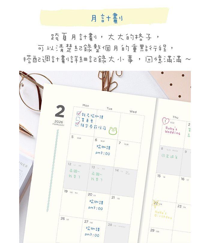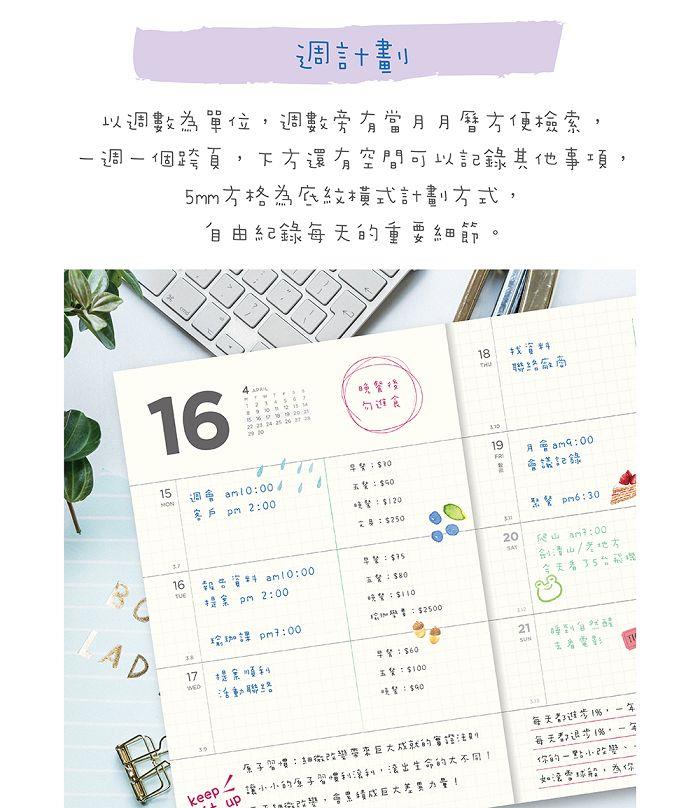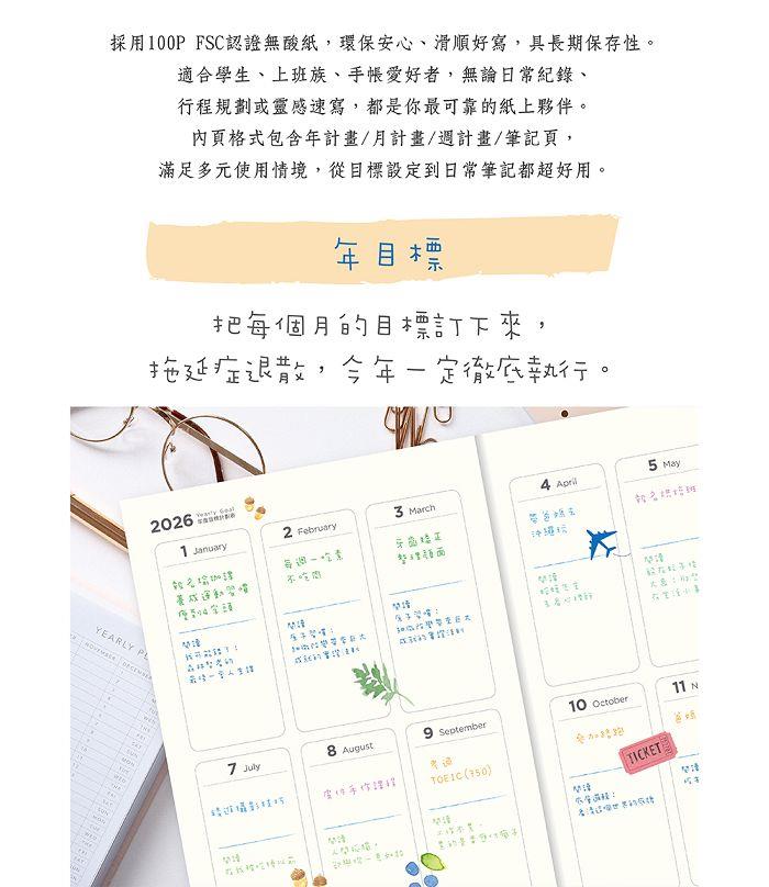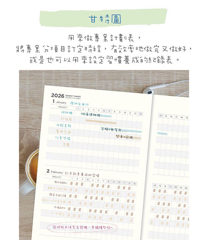 100P FSC米色中性無酸紙為FSC認證環保紙張紙質穩定不易滲墨,給予流暢的書寫手感內頁順序:年曆2P、年計劃2P、年目標2P、心願單2P、儲蓄表2P、甘特圖12P、月計劃24P 、週計劃106、筆記頁6P★適用20孔與6孔孔夾★
