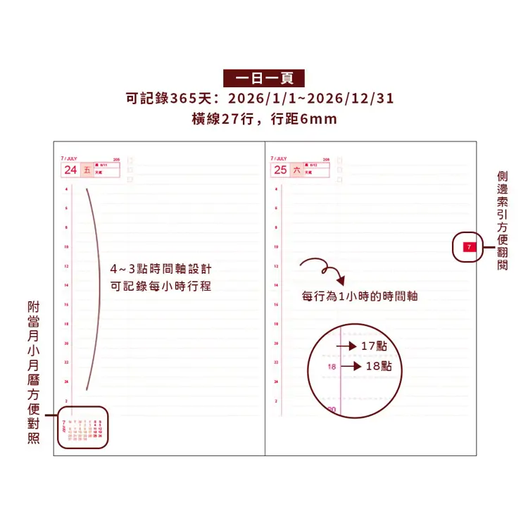 - 橫線1日1頁,可隨心書寫生活、依時間軸詳細記錄事項