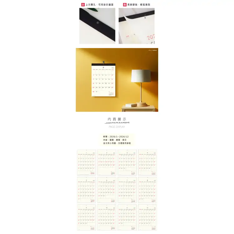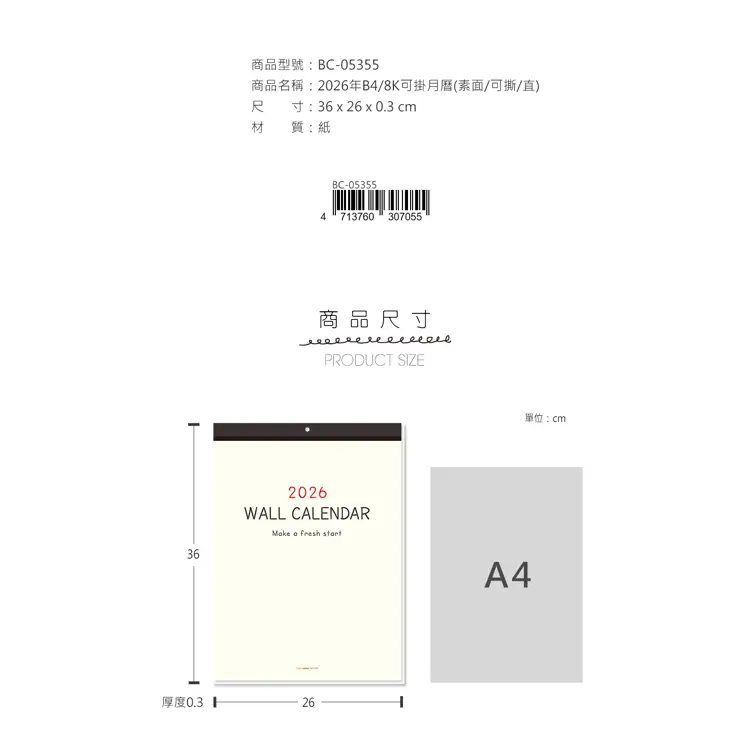 (特價)2026年B4可掛式月曆(素面/可撕/直)