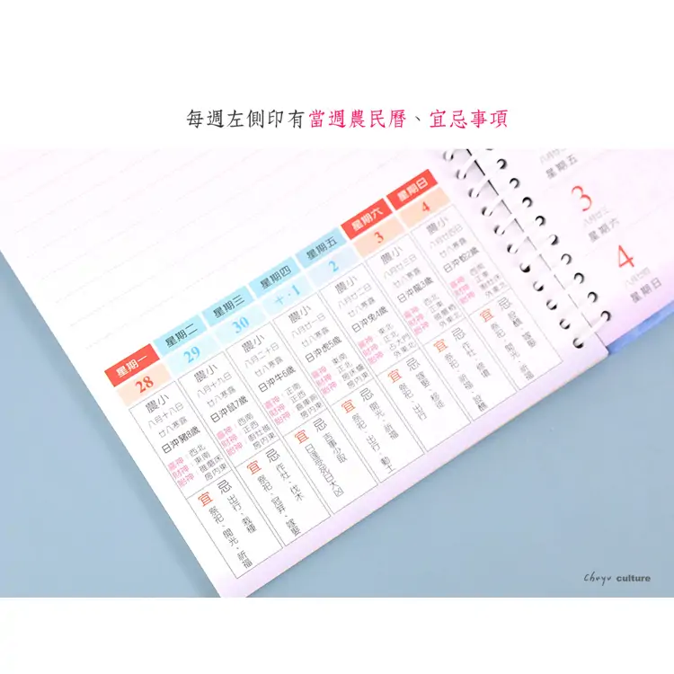 - 每週左側印有當週農民曆、宜忌事項