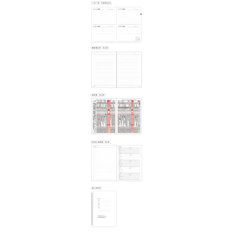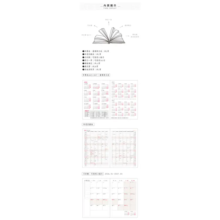 - 內容:年曆表.年月計劃.日計劃頁