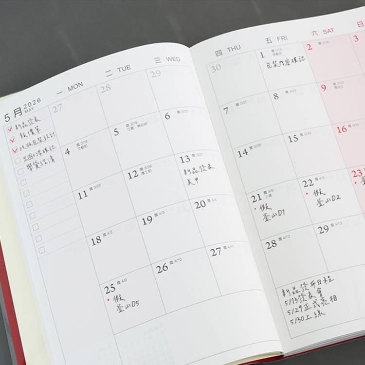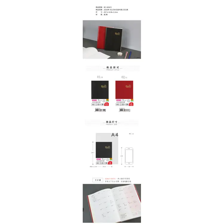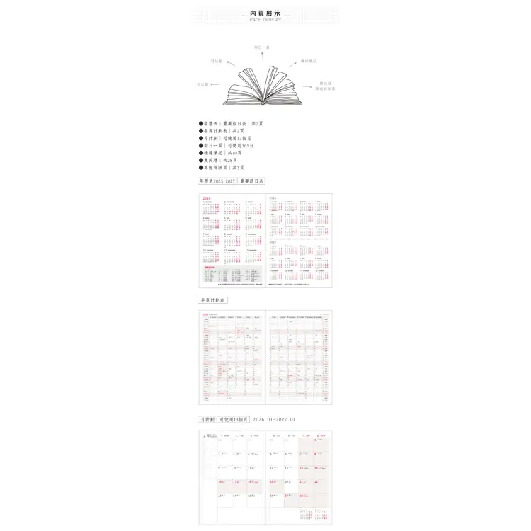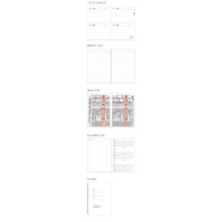 - 內容:年曆表.年月計劃.日計劃頁.農民曆