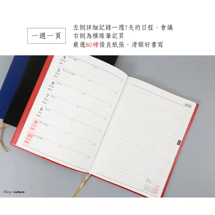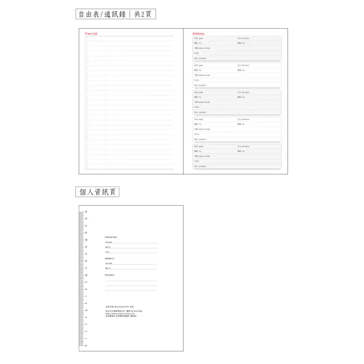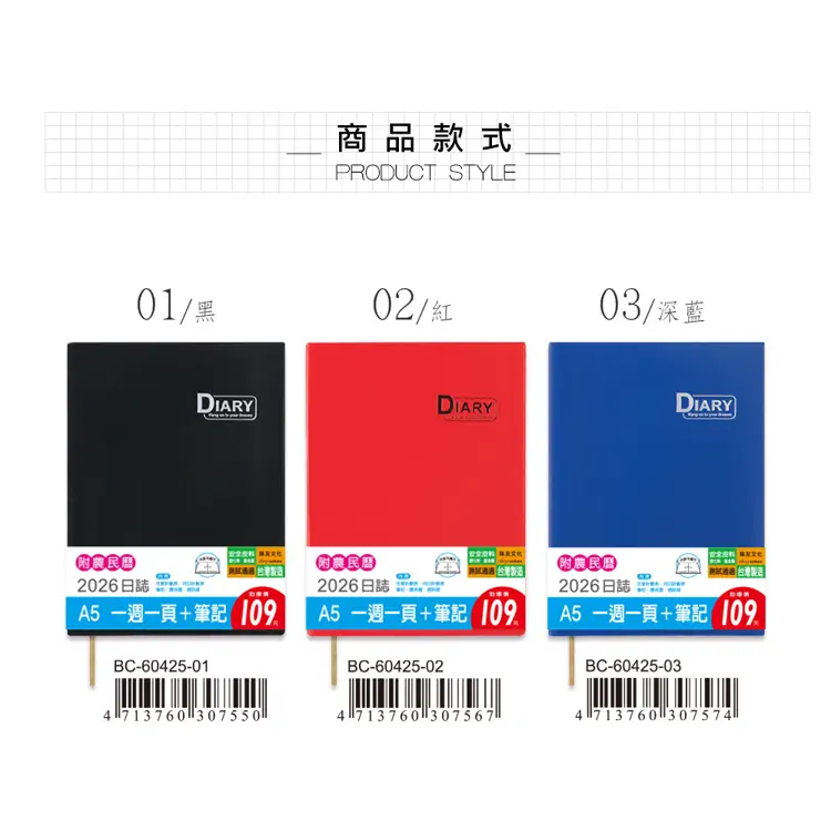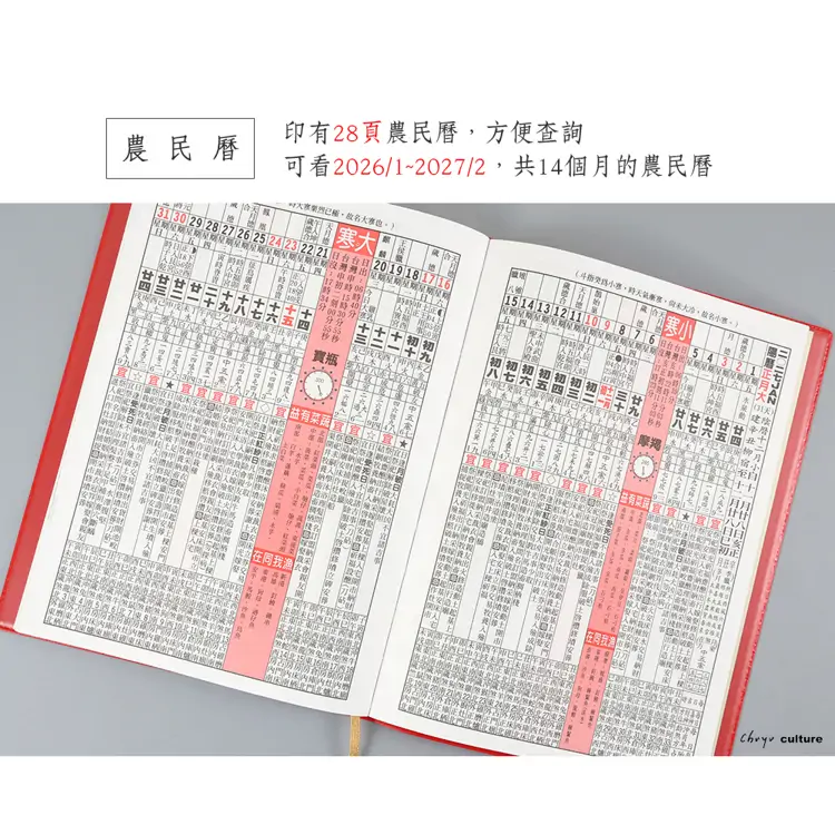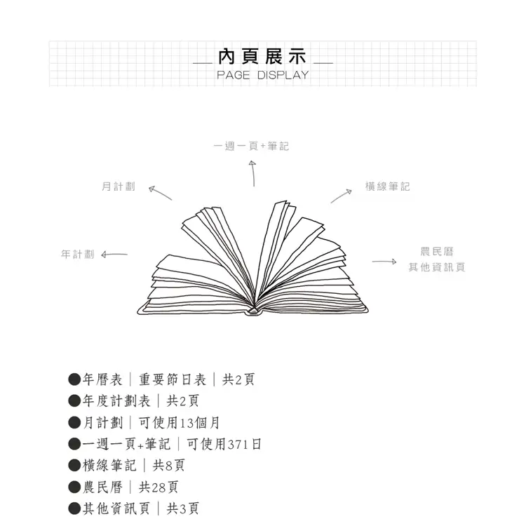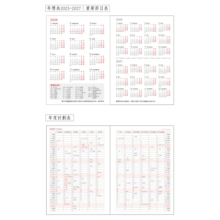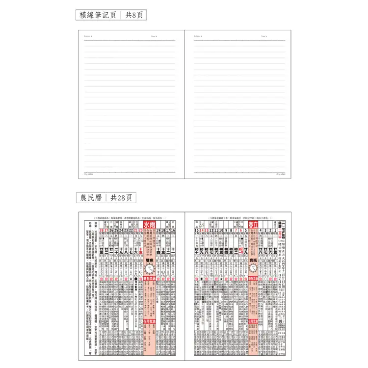 • 內容:年曆表.年月計劃.週計劃頁.農民曆