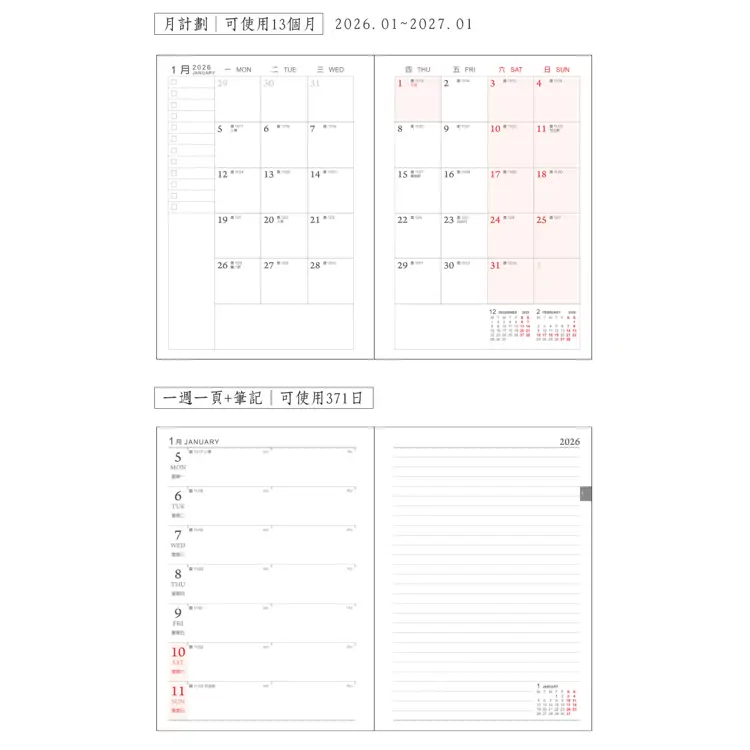 • 週計劃頁可書寫371天