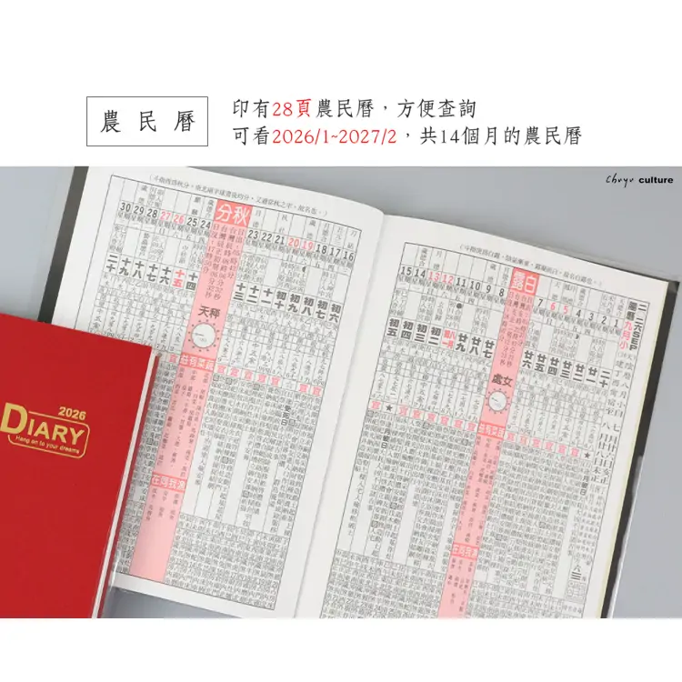 - 內容:年曆表.年月計劃.週計劃.農民曆