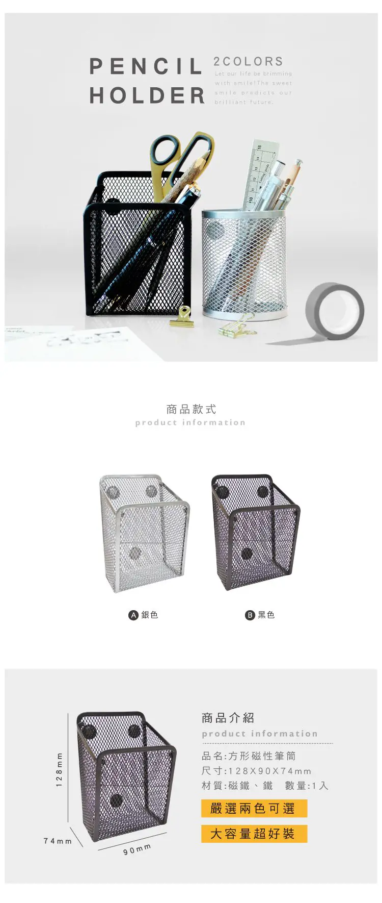 【商品說明】 1. 青青 簡單生活系列 CZ-877 方形磁性筆筒(128x90x74mm) 2.2種款式可選 3.背後有磁鐵 4.可裝筆、 釘書機......等文具 5. 另有其他款式【CZ-878_半圓磁性筆筒】可選擇喔!
