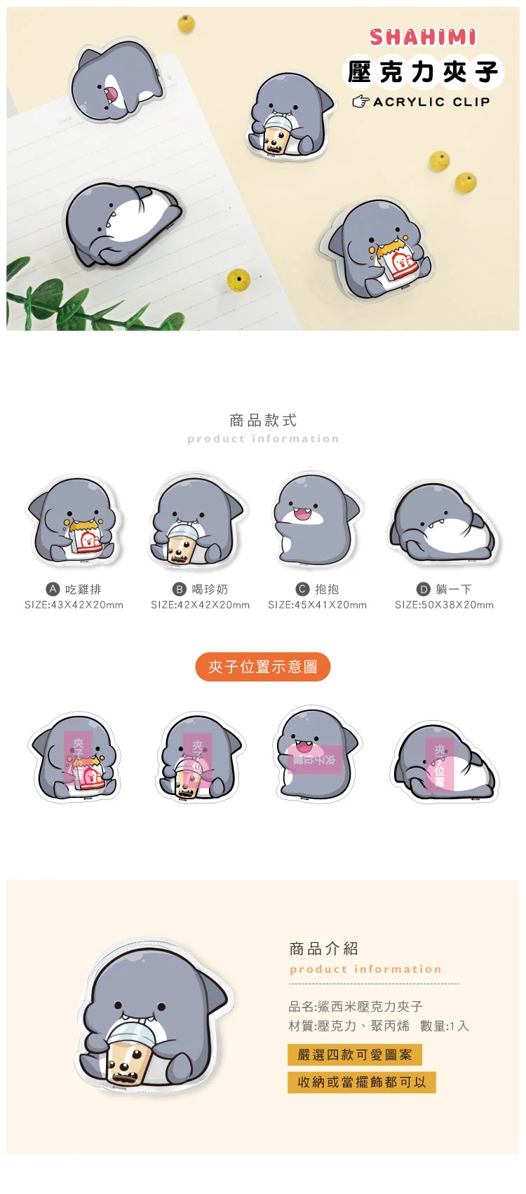 【商品說明】 1. 青青 鯊西米系列 CC-210 壓克力夾子 2. 尺寸:A/43X42X20mm、B/42X42X20mm、C/45X41X20mm、D/50X38X20mm 3. 嚴選4款可愛圖案