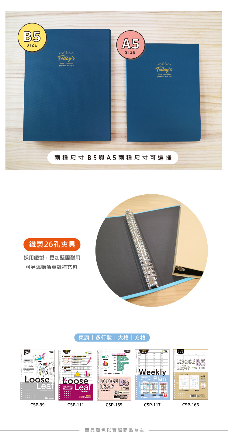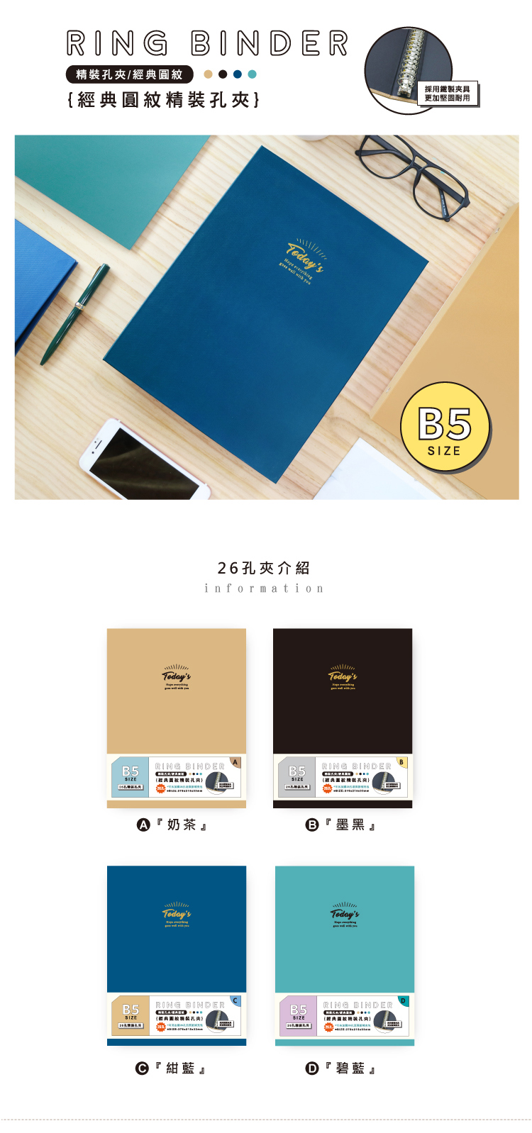 【商品說明】 1.青青 簡單生活系列 CBN-369 B5經典圓紋26孔精裝孔夾 (278*215*33mm) 2.嚴選四種簡約顏色 3.經典圓紋封面 X LOGO燙印 4.可自由添加不同格式之內頁