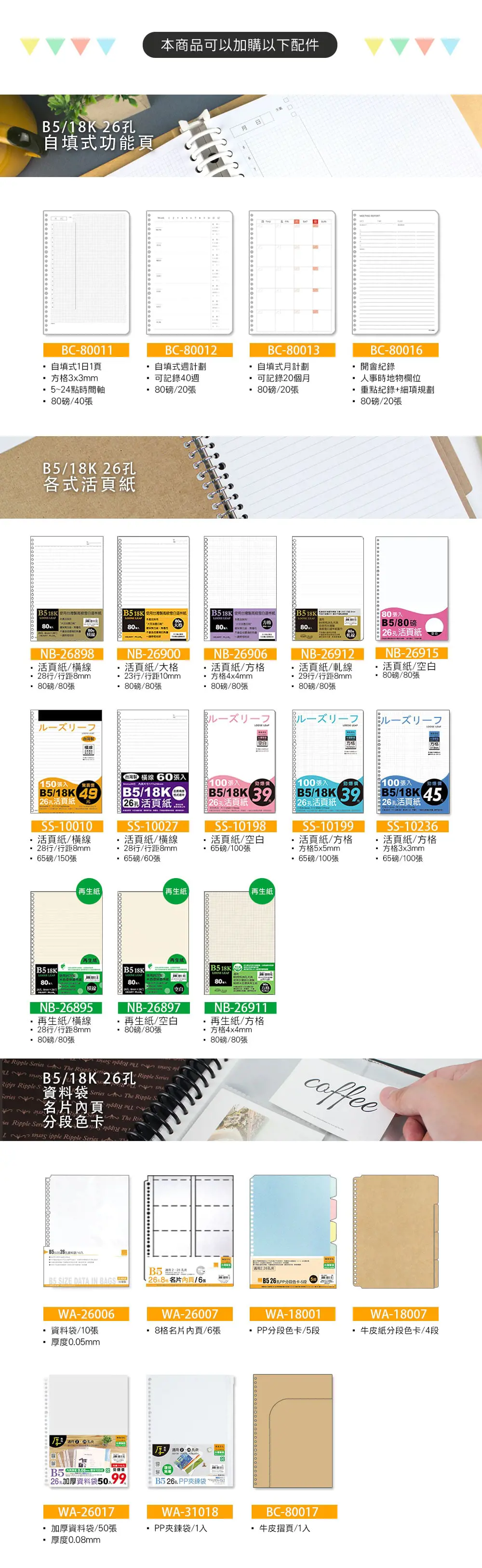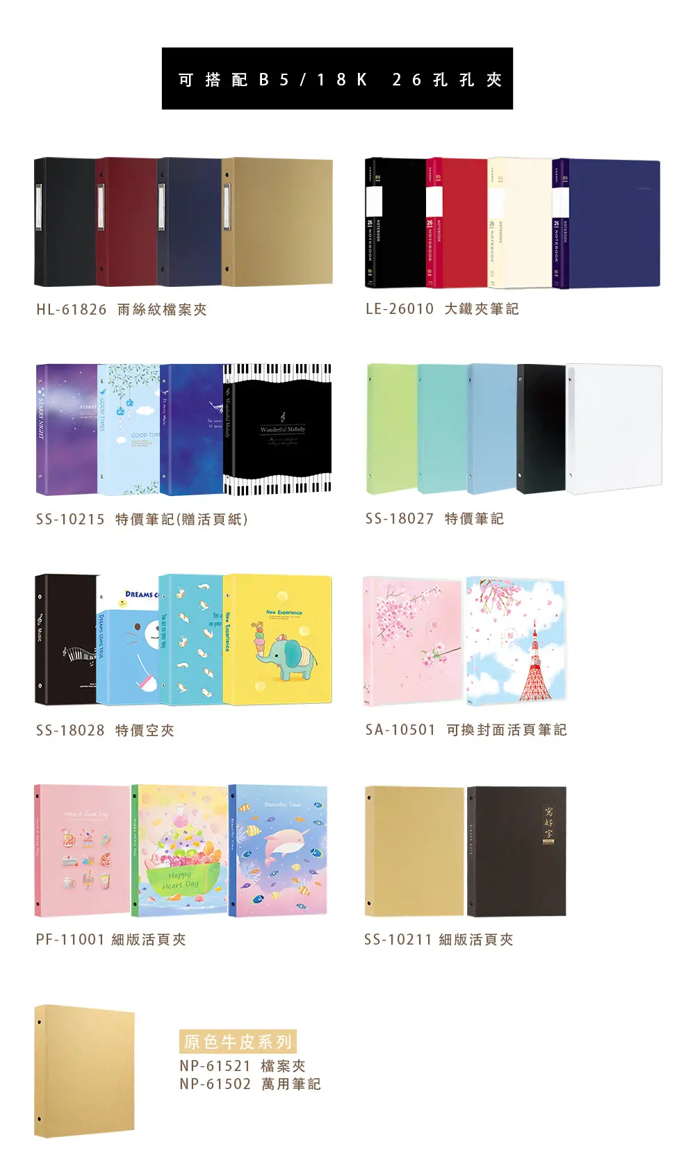- 本商品可適用於B5/18K 26孔滑動夾&萬用手冊