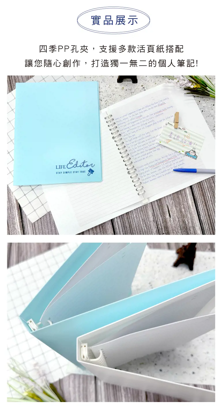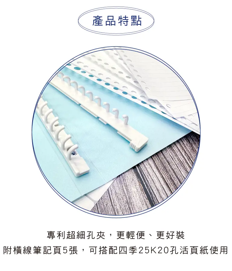 § 專利超細孔夾,輕便好裝,可搭配四季25K20孔活頁紙。