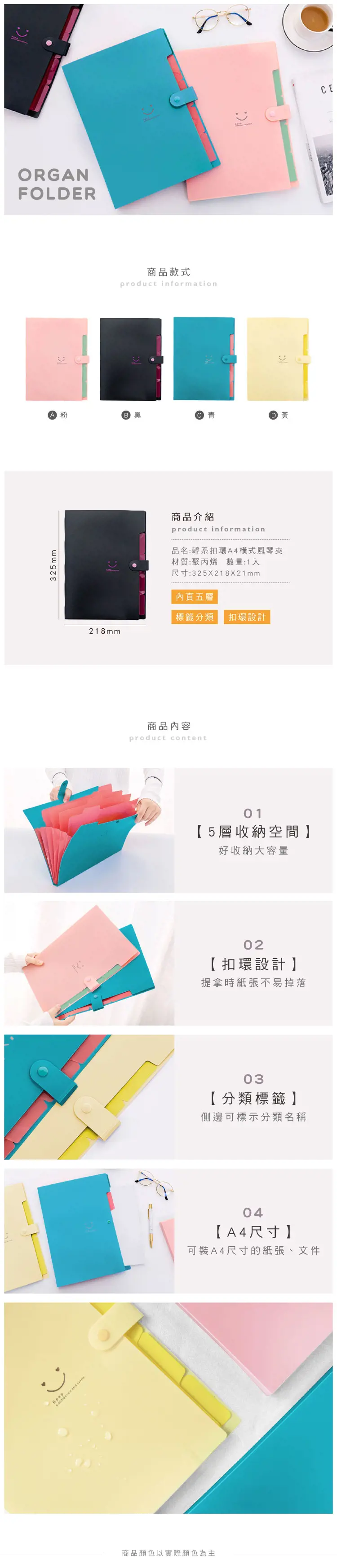 1. 青青 簡單生活系列 CZ-925 韓系環扣A4橫式風琴夾(325x218x21mm)