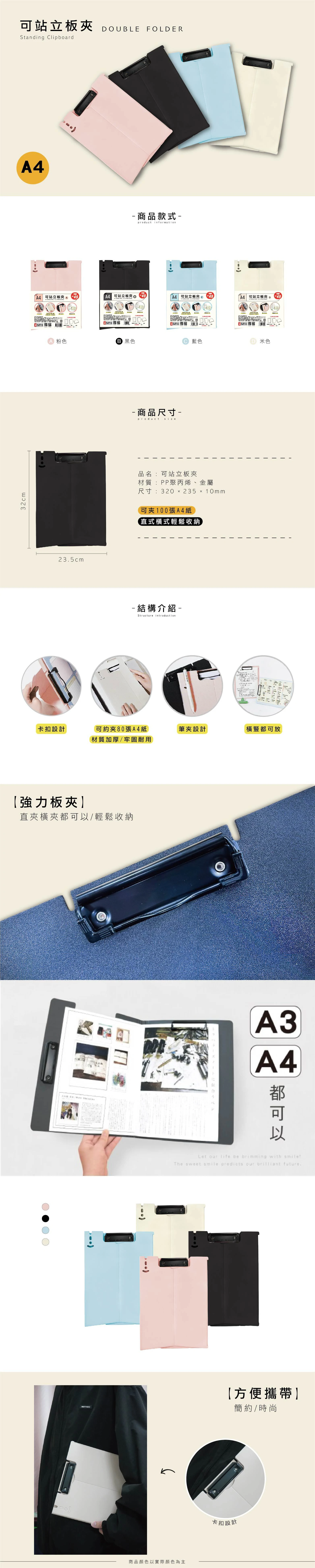 【商品說明】 1. 青青 簡單生活系列 CZ-953 A4雙夾文件夾(320x235x10mm) 2.單夾可夾A4/雙夾A3尺寸 3.最多可夾100張A4紙張 4. 嚴選四色可選擇
