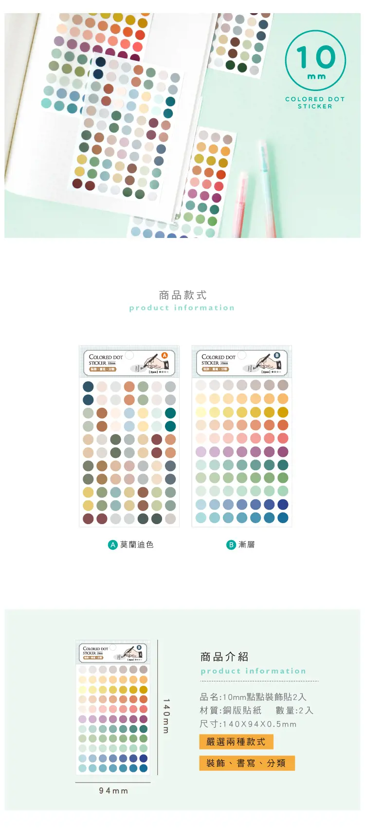 【商品說明】 1. 青青 簡單生活系列 CST-393 10mm點點裝飾貼2入(140X94X0.5mm) 2. 嚴選兩種色系可選 3. 材質 : 銅版貼紙 4.適用筆記本、原子筆、 紙袋、玻璃罐...等各種地方喔~