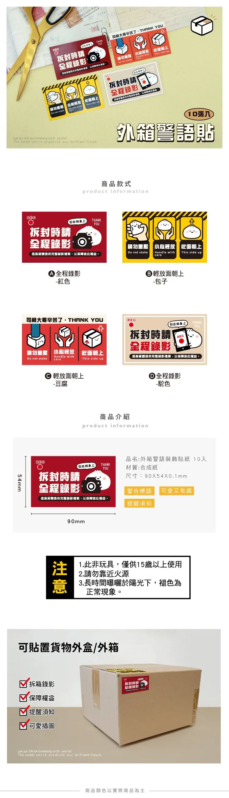 【商品說明】 1. 青青 小呸角系列 CST-418 外箱警語裝飾貼紙 10 入 2. 尺寸:90X54X0.1mm(單張)