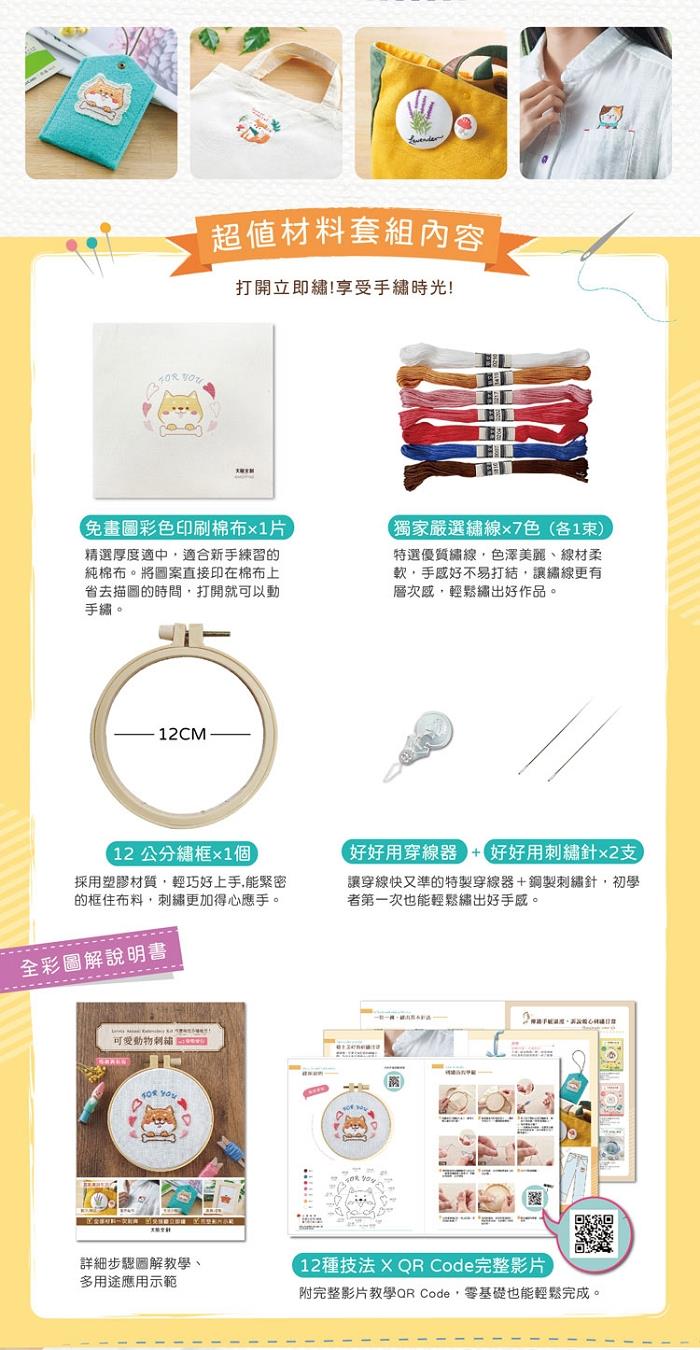 給新手的貼心入門指南,內附詳細圖解教學、多用途應用示範,並附贈完整QR Code全程動態影片教學,輕鬆體驗刺繡樂趣,第一次刺繡就上手。