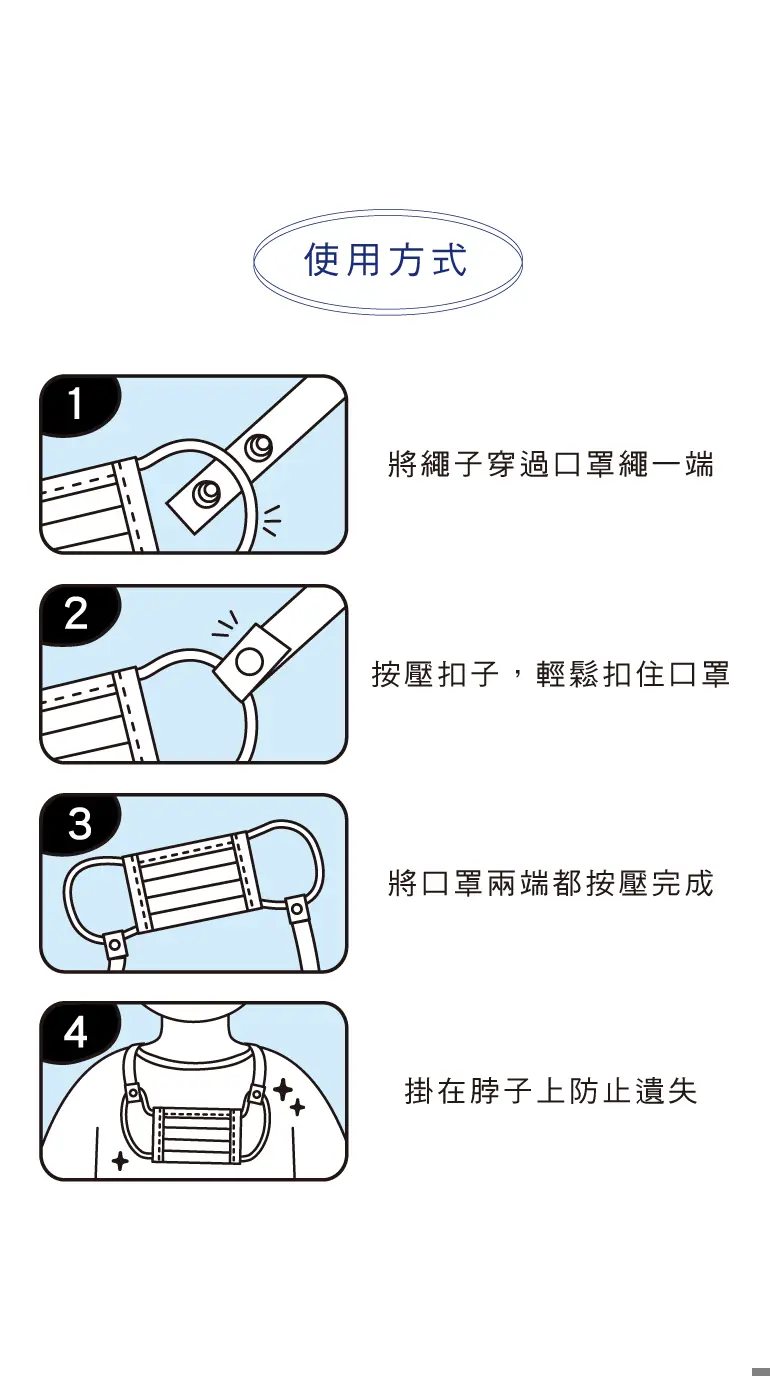 § 固定口罩不易遺失,可兩段長度調整。