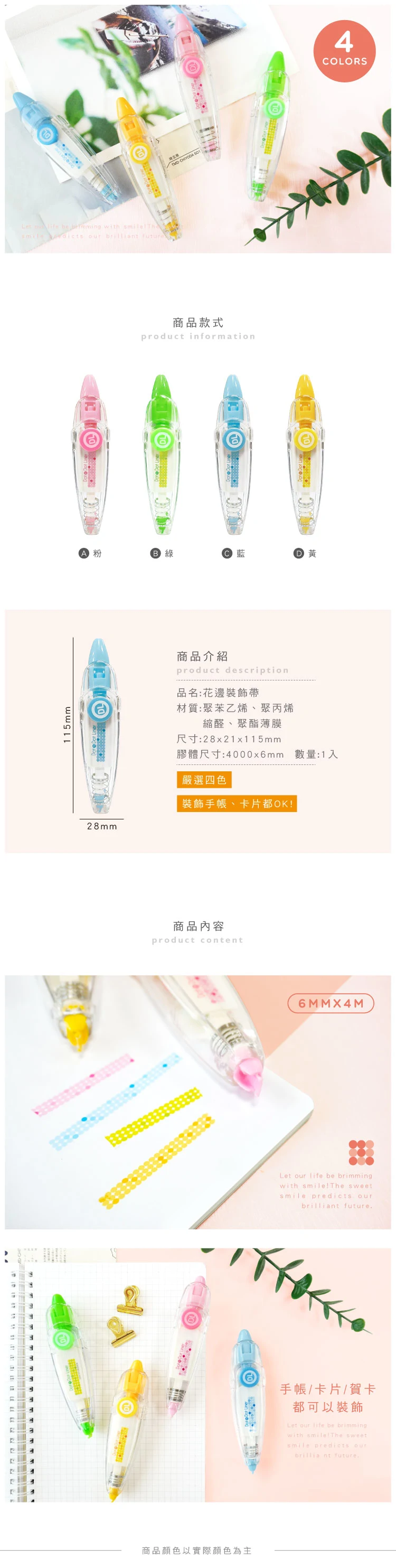 ◎手帳、卡片都可以裝飾【商品說明】 1.青青 簡單生活系列 CZ-931 圓點花邊裝飾帶(28x21x115mm) 2.膠體尺寸:4000x6mm 3. 嚴選四色