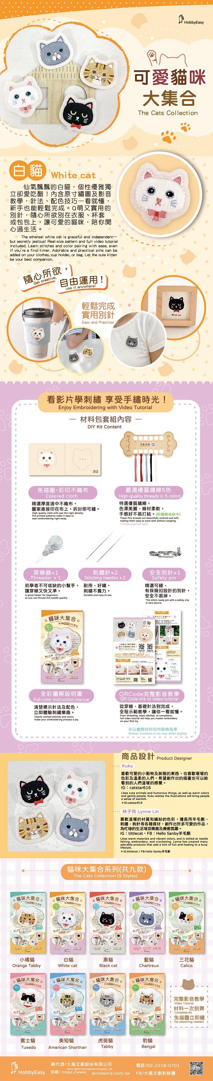 貓咪大集合刺繡材料包套組:白貓(附別針,含全程影音教學)