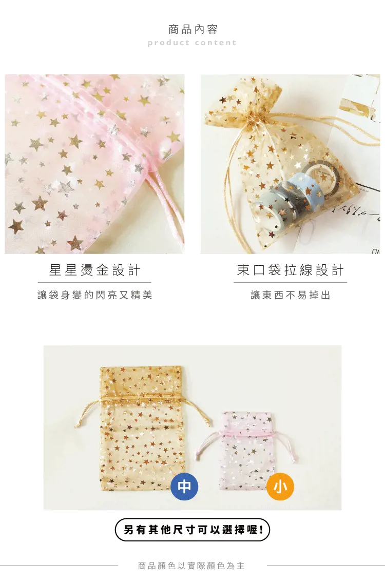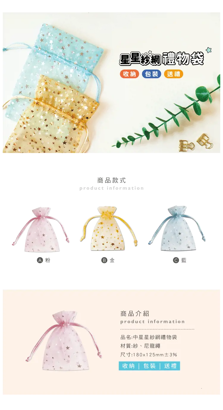 ◎可裝糖果、禮品、小物等 生日、婚宴、派對場合適用【商品說明】 1. 青青 簡單生活系列 CBG-597 中星星紗網禮物袋(180x125x5mm±3%) 2. 共3色/數量:1入 3. 可裝糖果、禮品、小物等 生日、婚宴、派對場合適用