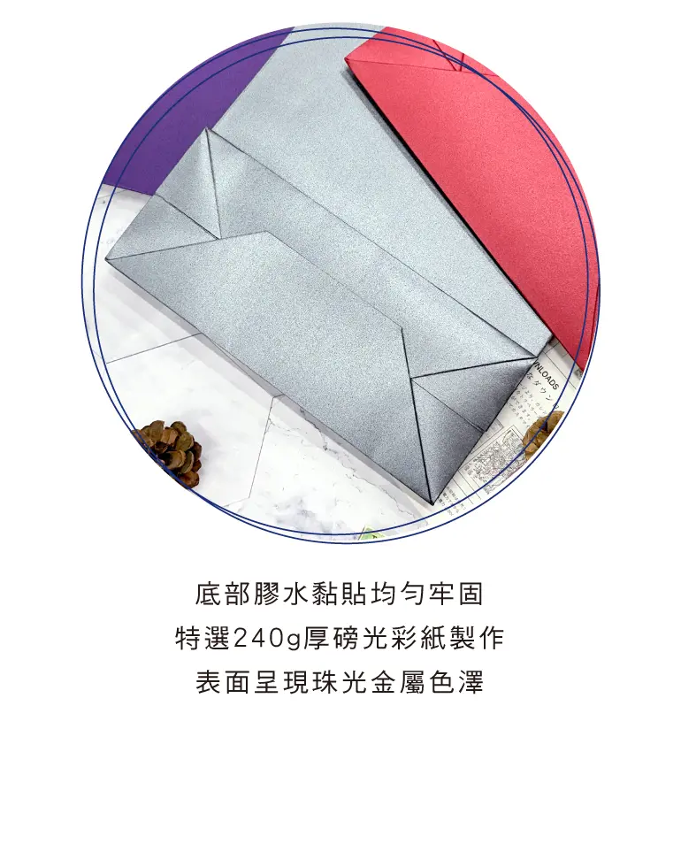 § 特選240g厚磅光彩紙製作,呈現珠光金屬色澤。